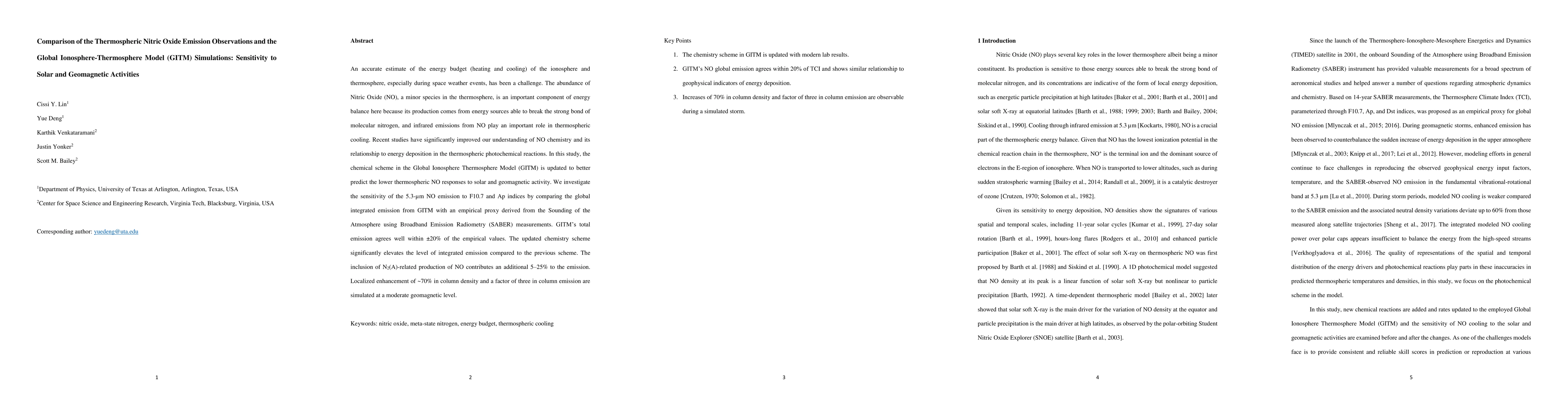 An accurate estimate of the energy budget (heating and cooling) of the ionosphere and thermosphere, especially during space weather events, has been a challenge. The abundance of Nitric Oxide (NO), a minor species in the thermosphere, is an important component of energy balance here because its production comes from energy sources able to break the strong bond of molecular nitrogen, and infrared emissions from NO play an important role in thermospheric cooling. Recent studies have significantly improved our understanding of NO chemistry and its relationship to energy deposition in the thermospheric photochemical reactions. In this study, the chemical scheme in the Global Ionosphere Thermosphere Model (GITM) is updated to better predict the lower thermospheric NO responses to solar and geomagnetic activity. We investigate the sensitivity of the 5.3-micron NO emission to F10.7 and Ap indices by comparing the global integrated emission from GITM with an empirical proxy derived from the Sounding of the Atmosphere using Broadband Emission Radiometry measurements. GITM's total emission agrees well within 20% of the empirical values. The updated chemistry scheme significantly elevates the level of integrated emission compared to the previous scheme. The inclusion of N2(A)-related production of NO contributes an additional 5-25% to the emission. Localized enhancement of ~70% in column density and a factor of three in column emission are simulated at a moderate geomagnetic level.