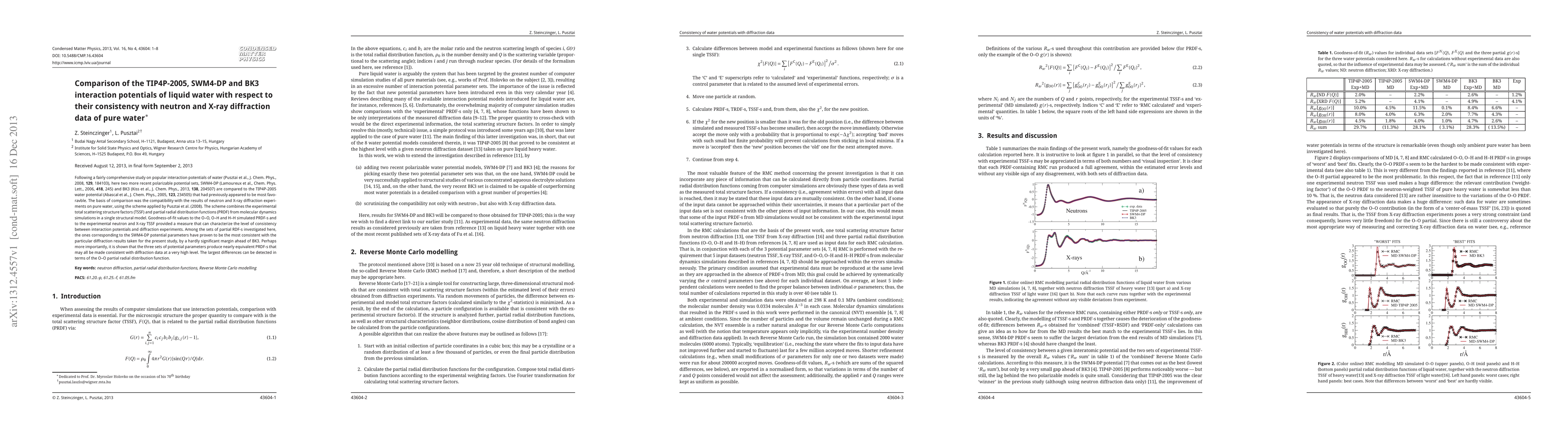 A study compared three water interaction potentials (TIP4P-2005, SWM4-DP, and BK3) with neutron and X-ray diffraction data of pure water, finding that the SWM4-DP potential is most consistent with the experimental data, followed closely by BK3.