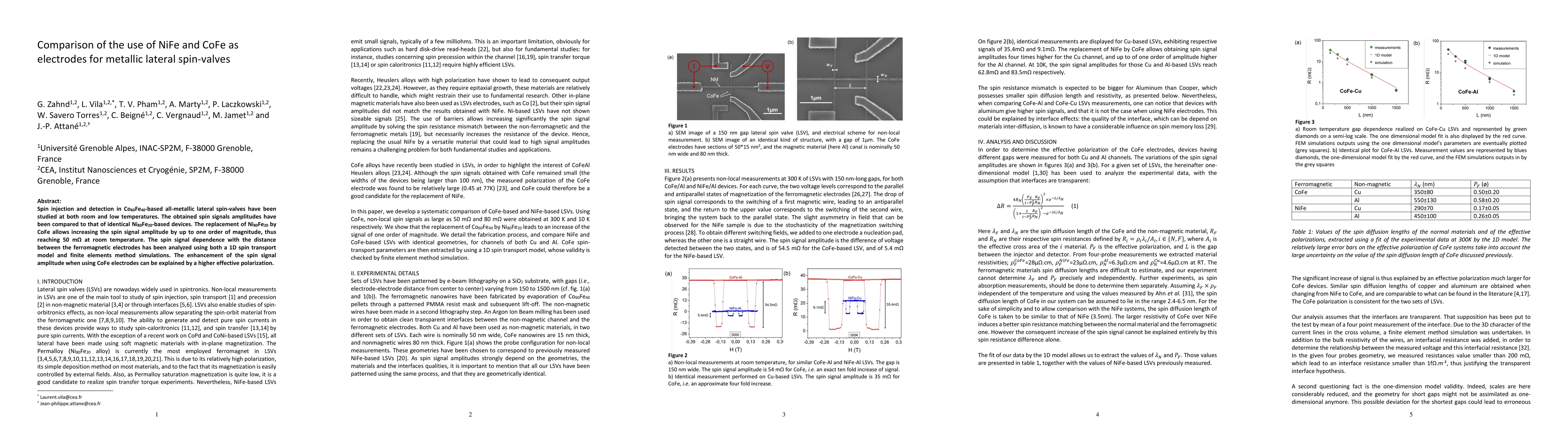 This study compares NiFe and CoFe electrodes in metallic lateral spin-valves, finding that CoFe significantly increases spin signal amplitude by an order of magnitude to 50 mΩ at room temperature, attributed to higher effective polarization. Simulation models validate this enhancement.