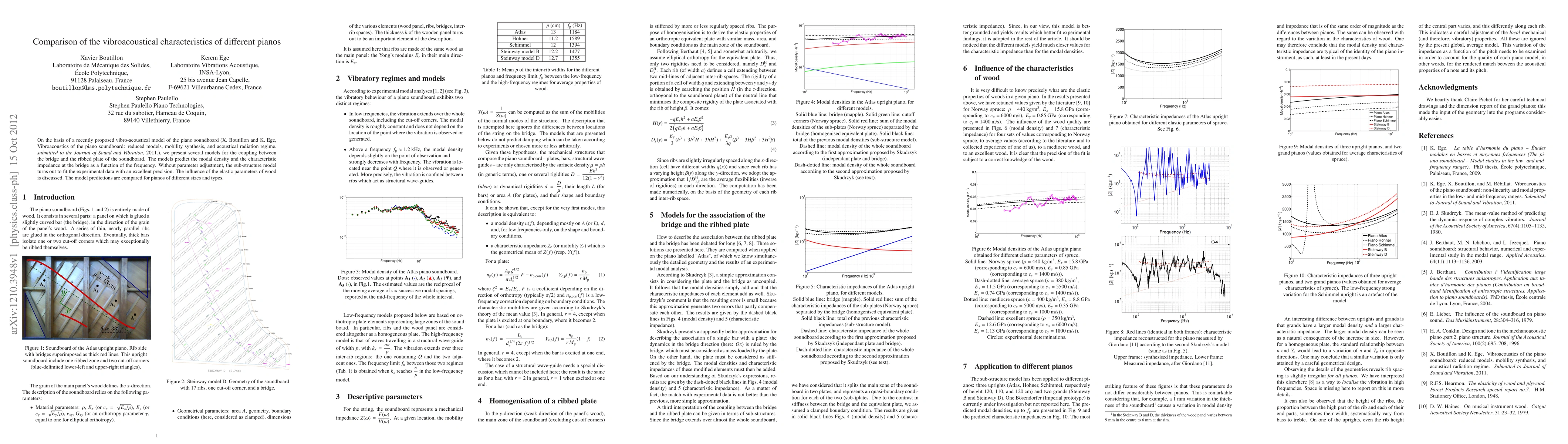 On the basis of a recently proposed vibro-acoustical model of the piano soundboard (X. Boutillon and K. Ege, Vibroacoustics of the piano soundboard: reduced models, mobility synthesis, and acoustical radiation regime. \emph{submitted to the Journal of Sound and Vibration}, 2011.), we present several models for the coupling between the bridge and the ribbed plate of the soundboard. The models predict the modal density and the characteristic impedance at the bridge as a function of the frequency. Without parameter adjustment, the sub-structure model turns out to fit the experimental data with an excellent precision. The influence of the elastic parameters of wood is discussed. The model predictions are compared for pianos of different sizes and types.