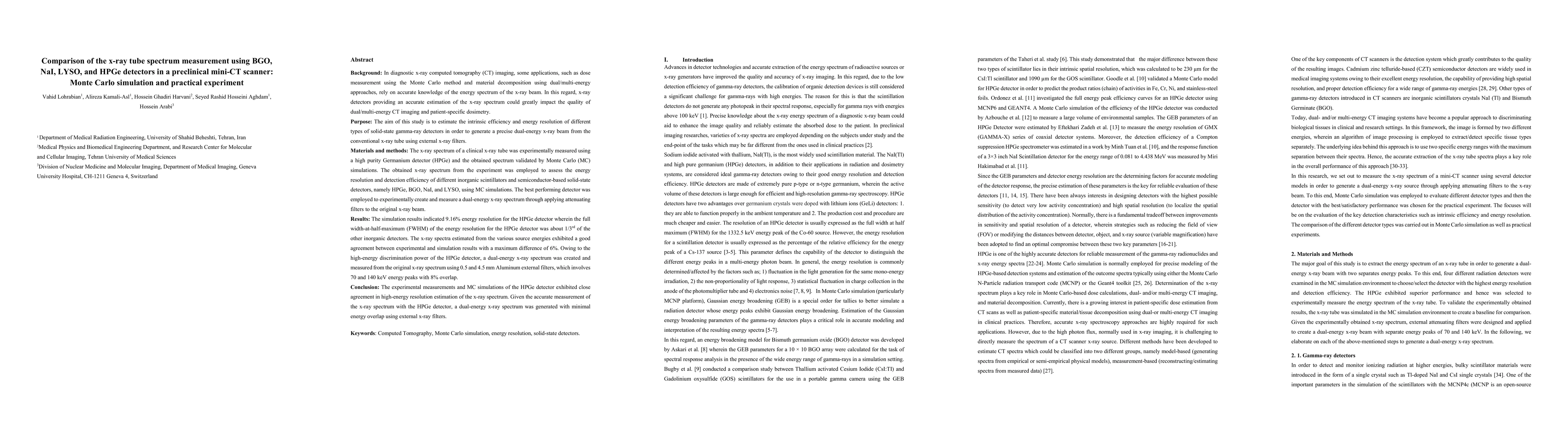 The aim of this study is to estimate the intrinsic efficiency and energy resolution of different types of solid-state gamma-ray detectors in order to generate a precise dual-energy x-ray beam from the conventional x-ray tube using external x-ray filters. The x-ray spectrum of a clinical x-ray tube was experimentally measured using a high purity Germanium detector (HPGe) and the obtained spectrum validated by Monte Carlo (MC) simulations. The obtained x-ray spectrum from the experiment was employed to assess the energy resolution and detection efficiency of different inorganic scintillators and semiconductor-based solid-state detectors, namely HPGe, BGO, NaI, and LYSO, using MC simulations. The best performing detector was employed to experimentally create and measure a dual-energy x-ray spectrum through applying attenuating filters to the original x-ray beam. The simulation results indicated a 9.16% energy resolution for the HPGe detector wherein the FWHM of the energy resolution for the HPGe detector was about 1/3rd of the other inorganic detectors. The x-ray spectra estimated from the various source energies exhibited a good agreement between experimental and simulation results with a maximum difference of 6%. Owing to the high-energy discrimination power of the HPGe detector, a dual-energy x-ray spectrum was created and measured from the original x-ray spectrum using 0.5 and 4.5 mm Aluminum external filters, which involves 70 and 140 keV energy peaks with 8% overlap. The experimental measurements and MC simulations of the HPGe detector exhibited close agreement in high-energy resolution estimation of the x-ray spectrum. Given the accurate measurement of the x-ray spectrum with the HPGe detector, a dual-energy x-ray spectrum was generated with minimal energy overlap using external x-ray filters.