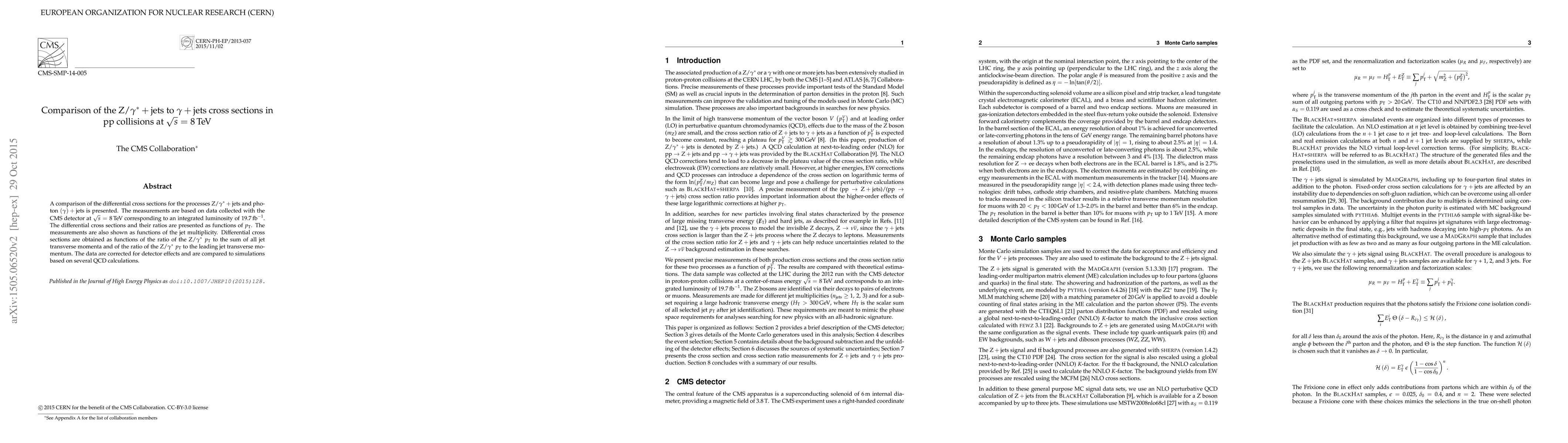 This paper compares differential cross sections for Z/gamma* + jets and gamma + jets processes in proton-proton collisions at 8 TeV, using CMS detector data. The results are presented as functions of transverse momentum and jet multiplicity, and compared to QCD simulations.