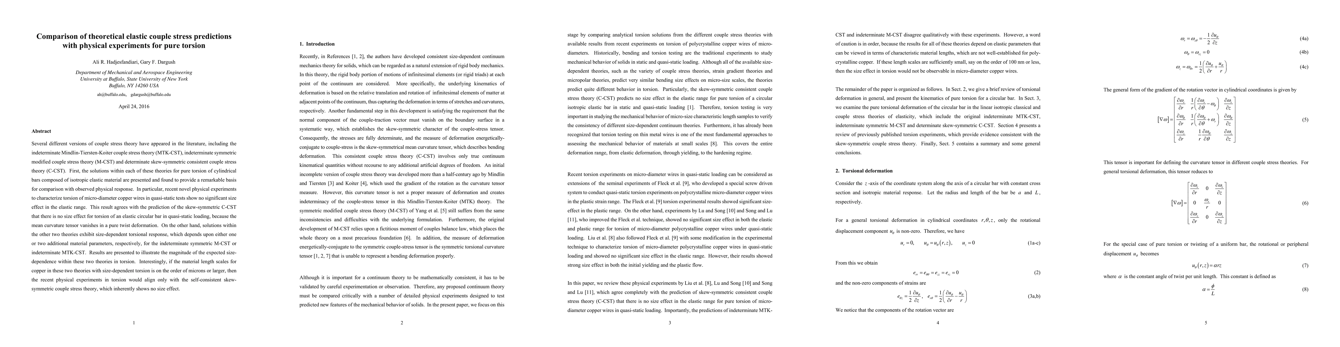 This paper compares theoretical predictions of couple stress theories for pure torsion with physical experiments on micro-diameter copper wires. The skew-symmetric consistent couple stress theory aligns with experimental results showing no size effect in torsion, while other theories predict size-dependent behavior.