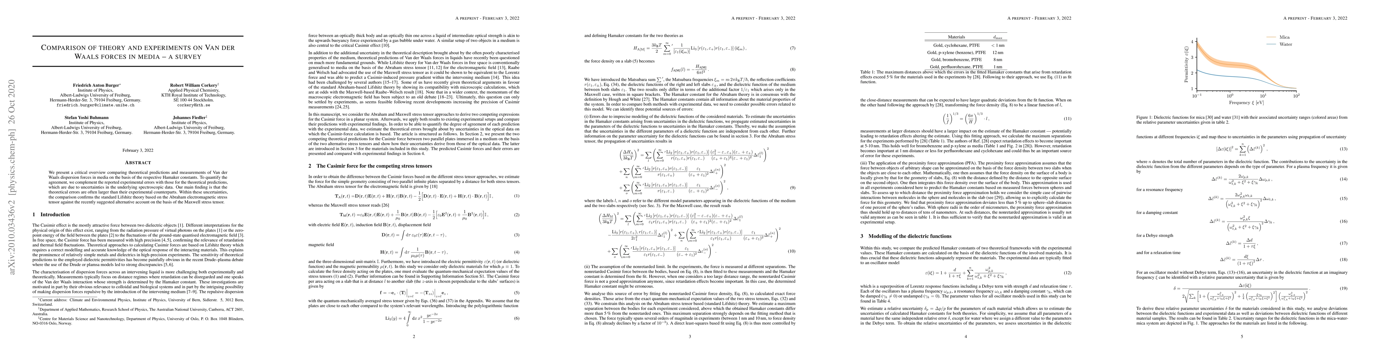This survey compares theoretical predictions and experimental measurements of Van der Waals forces in media through Hamaker constants. It reveals that theoretical uncertainties, stemming from spectroscopic data, often exceed experimental errors. The analysis supports the traditional Lifshitz theory, based on the Abraham stress tensor, over alternative Maxwell-tensor-based approaches within these uncertainties.