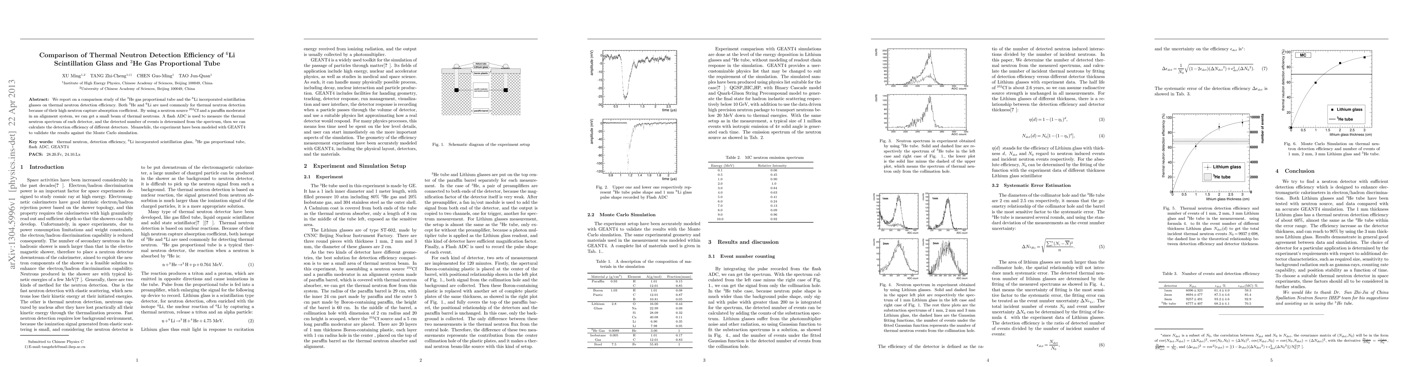 We report on a comparison study of the $^{3}$He gas proportional tube and the $^{6}$Li incorporated scintillation glasses on thermal neutron detection efficiency. Both $^{3}$He and $^{6}$Li are used commonly for thermal neutron detection because of their high neutron capture absorption coefficient. By using a neutron source $^{252}$Cf and a paraffin moderator in an alignment system, we can get a small beam of thermal neutrons. A flash ADC is used to measure the thermal neutron spectrum of each detector, and the detected number of events is determined from the spectrum, then we can calculate the detection efficiency of different detectors. Meanwhile, the experiment have been modeled with GEANT4 to validate the results against the Monte Carlo simulation.