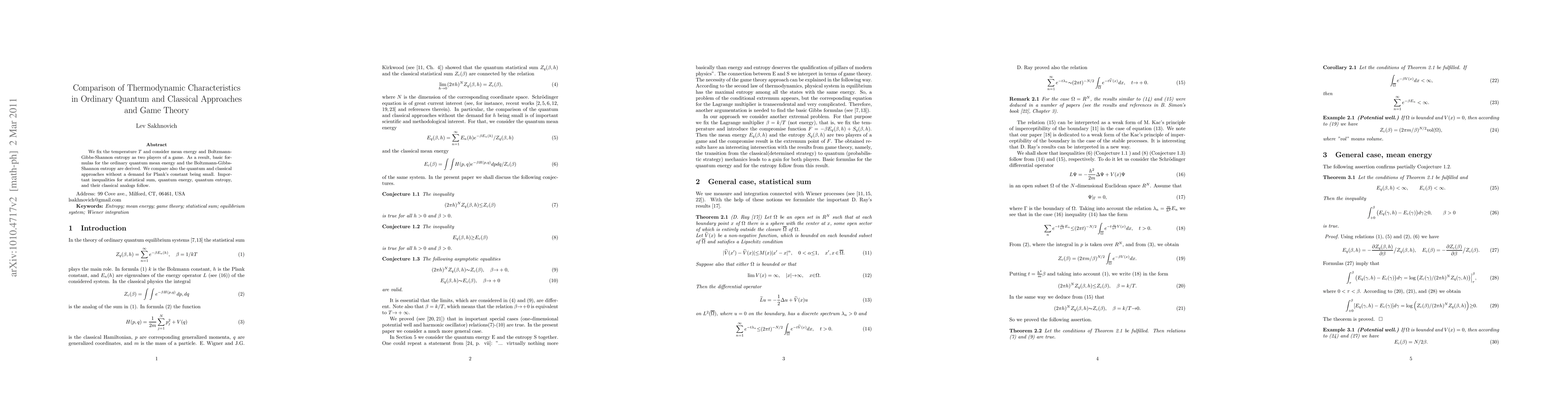 We fix the temperature $T$ and consider mean energy and Boltzmann-Gibbs-Shannon entropy as two players of a game. As a result, basic formulas for the ordinary quantum mean energy and the Boltzmann-Gibbs-Shannon entropy are derived. We compare also the quantum and classical approaches without a demand for Plank's constant being small. Important inequalities for statistical sum, quantum energy, quantum entropy, and their classical analogs follow.