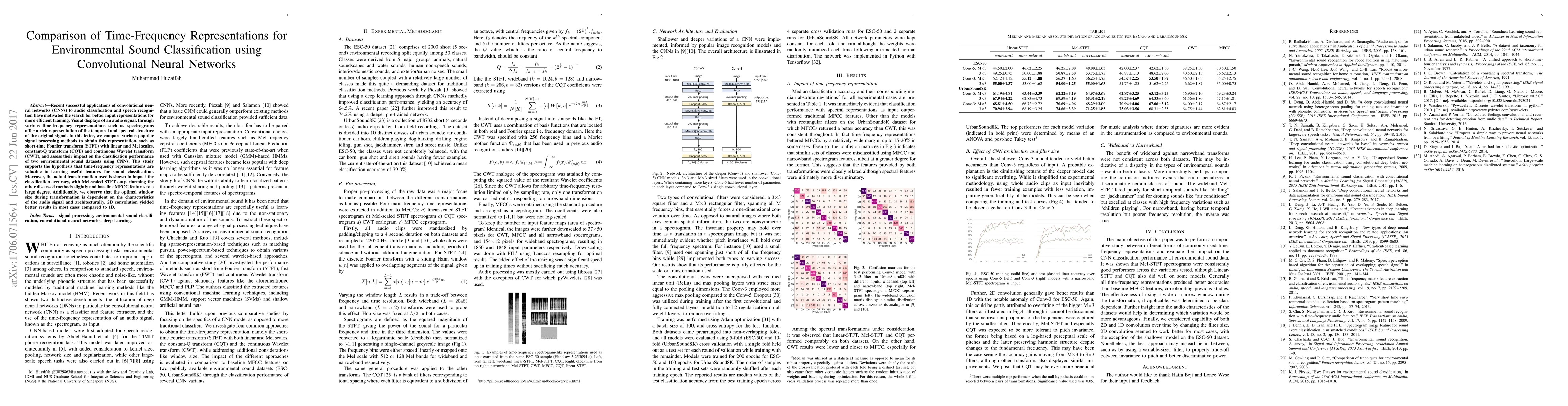 This paper compares various time-frequency representations for environmental sound classification using CNNs, finding that Mel-scaled STFT provides slightly better performance than other methods like STFT, CQT, and CWT. It concludes that 2D convolution generally outperforms 1D convolution for this task.