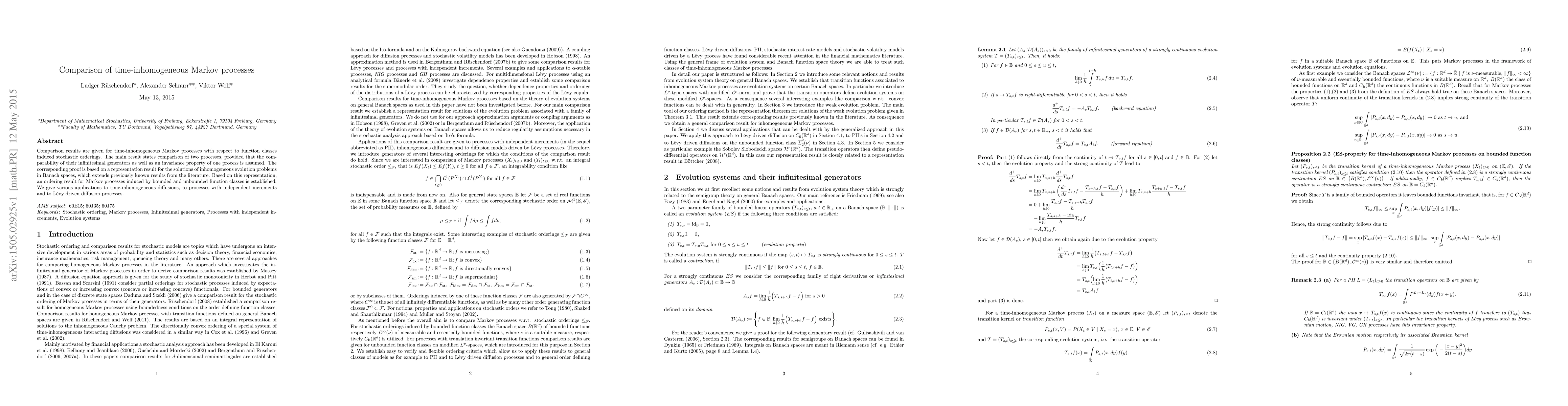 This paper compares time-inhomogeneous Markov processes using stochastic orderings based on function classes and establishes a main result linking the processes through the comparability of their infinitesimal generators and an invariance property. The proof leverages a new representation of solutions to inhomogeneous evolution problems in Banach spaces.