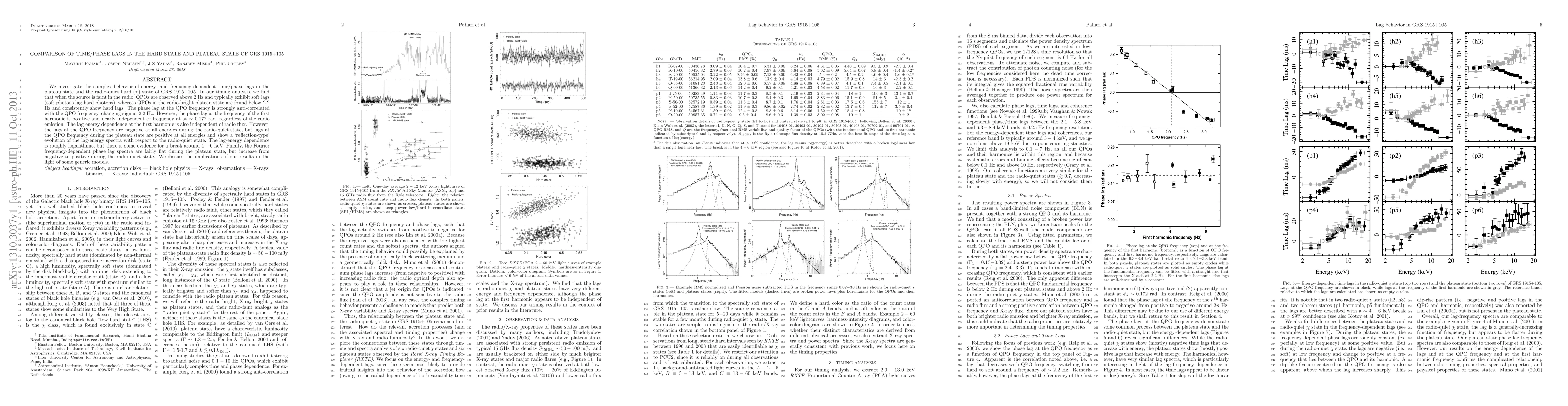 We investigate the complex behavior of energy- and frequency-dependent time/phase lags in the plateau state and the radio-quiet hard state of GRS 1915+105. In our timing analysis, we find that when the source is faint in the radio, QPOs are observed above 2 Hz and typically exhibit soft lags (soft photons lag hard photons), whereas QPOs in the radio-bright plateau state are found below 2.2 Hz and consistently show hard lags. The phase lag at the QPO frequency is strongly anti-correlated with the QPO frequency, changing sign at 2.2 Hz. However, the phase lag at the frequency of the first harmonic is positive and nearly independent of frequency at at ~0.172 rad, regardless of the radio emission. The lag-energy dependence at the first harmonic is also independent of radio flux. However, the lags at the QPO frequency are negative at all energies during the radio-quiet state, but lags at the QPO frequency during the plateau state are positive at all energies and show a 'reflection-type' evolution of the lag-energy spectra with respect to the radio-quiet state. The lag-energy dependence is roughly logarithmic, but there is some evidence for a break around 4-6 keV. Finally, the Fourier frequency-dependent phase lag spectra are fairly flat during the plateau state, but increase from negative to positive during the radio-quiet state. We discuss the implications of our results in the light of some generic models.