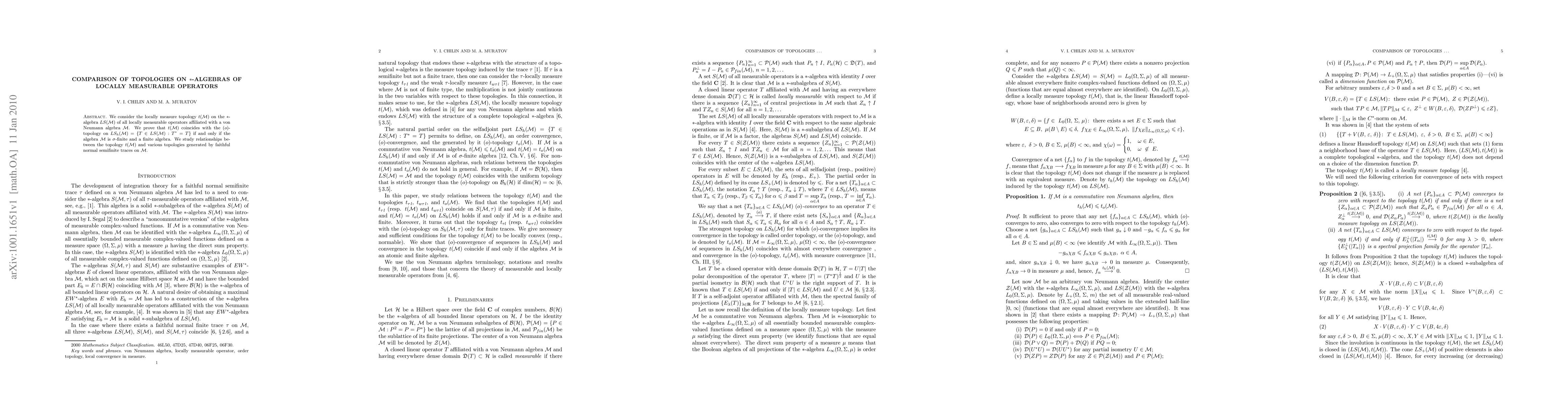 We consider the locally measure topology $t(\mathcal{M})$ on the *-algebra $LS(\mathcal{M})$ of all locally measurable operators affiliated with a von Neumann algebra $\mathcal{M}$. We prove that $t(\mathcal{M})$ coincides with the $(o)$-topology on $LS_h(\mathcal{M})=\{T\in LS(\mathcal{M}): T^*=T\}$ if and only if the algebra $\mathcal{M}$ is $\sigma$-finite and a finite algebra. We study relationships between the topology $t(\mathcal{M})$ and various topologies generated by faithful normal semifinite traces on $\mathcal{M}$.