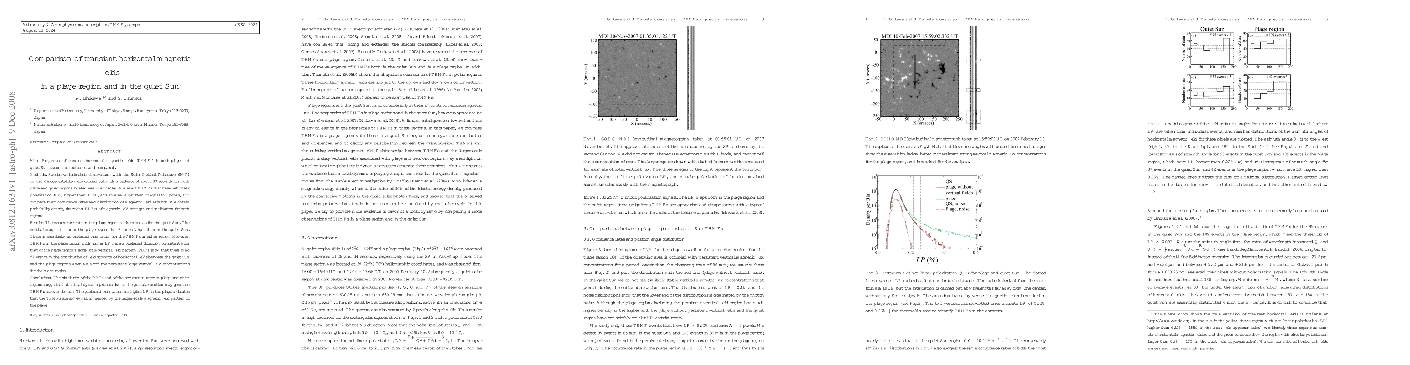 This paper compares transient horizontal magnetic fields (THMFs) in solar plage regions and quiet Sun areas using Hinode satellite observations. It finds similar occurrence rates but a higher vertical magnetic flux in plages, with no preferred orientation for THMFs in either region, though higher LP in plages aligns with the large-scale vertical field.