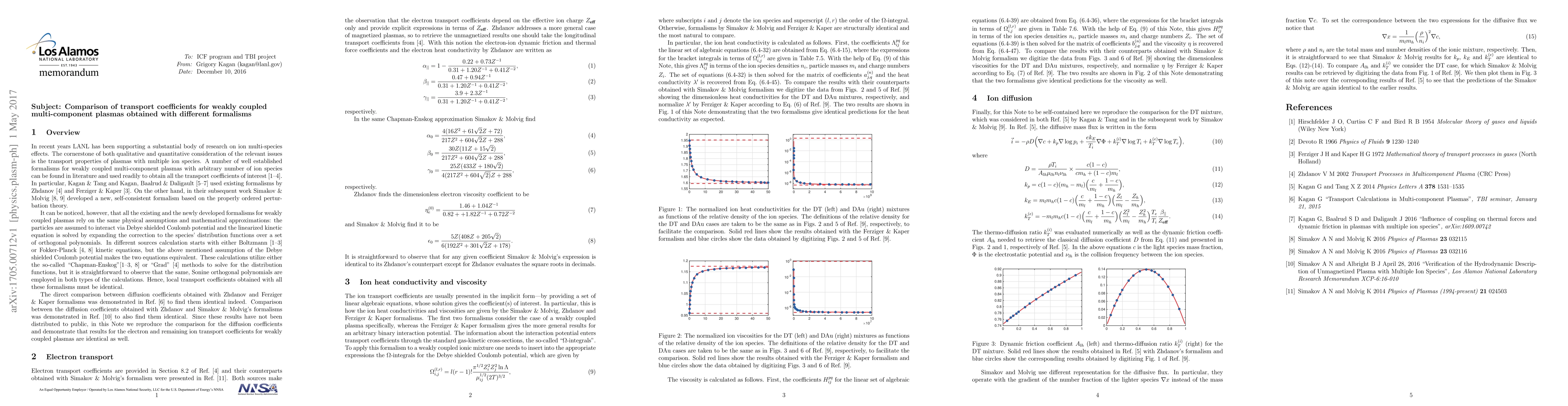 LANL Memorandum of potentially broad interest. A direct comparison is performed between transport coefficients for weakly coupled plasmas obtained with different formalisms to demonstrate that these formalisms give identical predictions. This is what one would expect since for weakly coupled plasmas all the formalisms rely on the same physical assumptions and mathematical approximations.