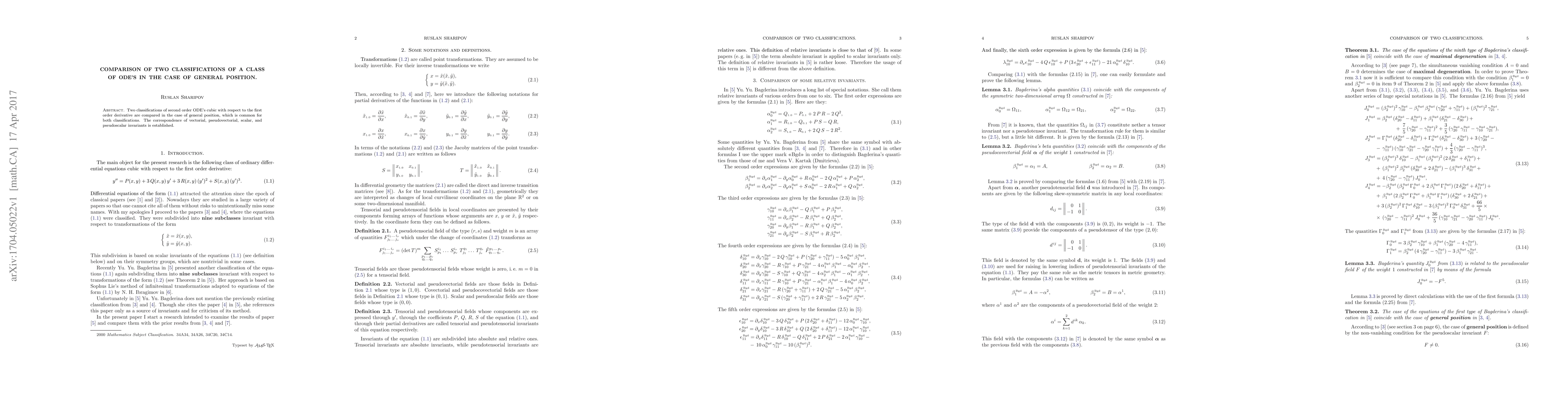 Two classifications of second order ODE's cubic with respect to the first order derivative are compared in the case of general position, which is common for both classifications. The correspondence of vectorial, pseudovectorial, scalar, and pseudoscalar invariants is established.
