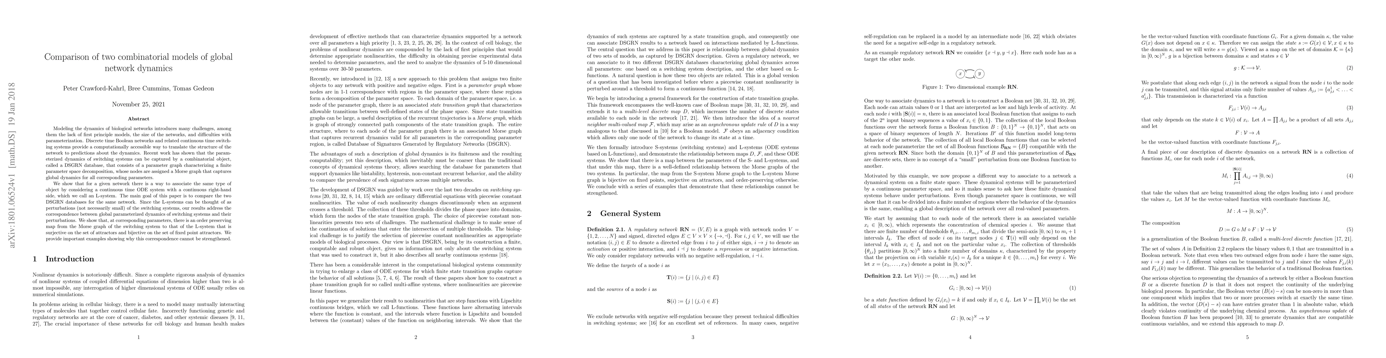 Modeling the dynamics of biological networks introduces many challenges, among them the lack of first principle models, the size of the networks, and difficulties with parameterization. Discrete time Boolean networks and related continuous time switching systems provide a computationally accessible way to translate the structure of the network to predictions about the dynamics. Recent work has shown that the parameterized dynamics of switching systems can be captured by a combinatorial object, called a DSGRN database, that consists of a parameter graph characterizing a finite parameter space decomposition, whose nodes are assigned a Morse graph that captures global dynamics for all corresponding parameters. We show that for a given network there is a way to associate the same type of object by considering a continuous time ODE system with a continuous right-hand side, which we call an L-system. The main goal of this paper is to compare the two DSGRN databases for the same network. Since the L-systems can be thought of as perturbations (not necessarily small) of the switching systems, our results address the correspondence between global parameterized dynamics of switching systems and their perturbations. We show that, at corresponding parameters, there is an order preserving map from the Morse graph of the switching system to that of the L-system that is surjective on the set of attractors and bijective on the set of fixed point attractors. We provide important examples showing why this correspondence cannot be strengthened.