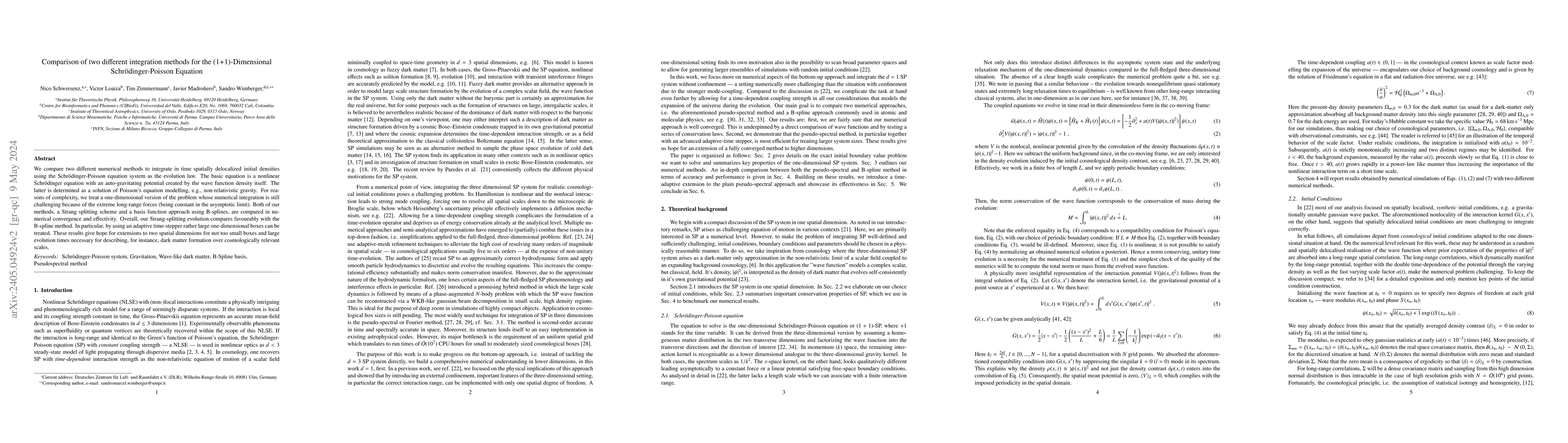 This paper compares two numerical methods—a Strang splitting scheme and a B-spline approach—for integrating the (1+1)-Dimensional Schrödinger-Poisson equation, highlighting superior convergence and effectiveness of the Strang splitting method, especially with adaptive time-stepping. The results suggest potential for extending the method to two dimensions for modeling dark matter formation.
