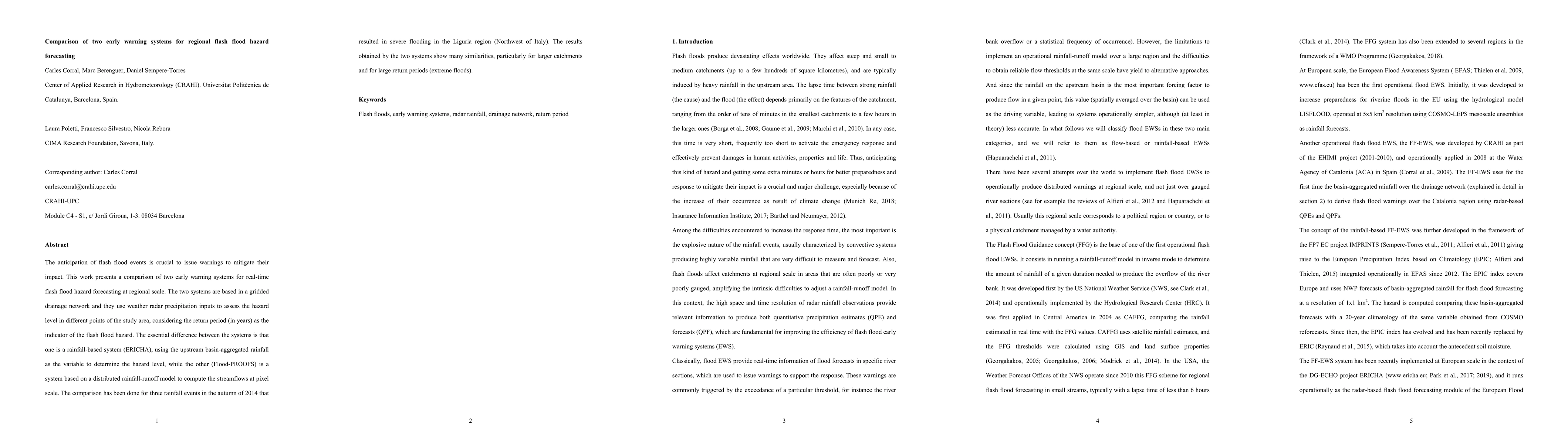 This study compares two early warning systems for regional flash flood hazard forecasting, utilizing weather radar data. The rainfall-based ERICHA and the distributed rainfall-runoff model Flood-PROOFS show similarities, especially for larger catchments and extreme floods, based on analysis of severe autumn 2014 events in Liguria, Italy.