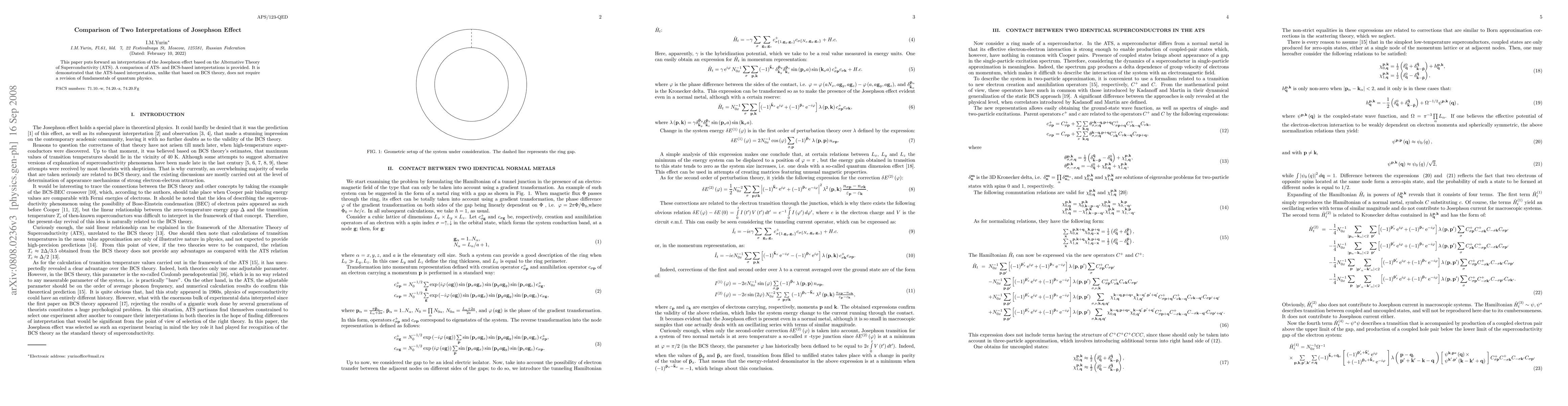 This paper puts forward an interpretation of the Josephson effect based on the Alternative Theory of Superconductivity (ATS). A comparison of ATS- and BCS-based interpretations is provided. It is demonstrated that the ATS-based interpretation, unlike that based on BCS theory, does not require a revision of fundamentals of quantum physics.