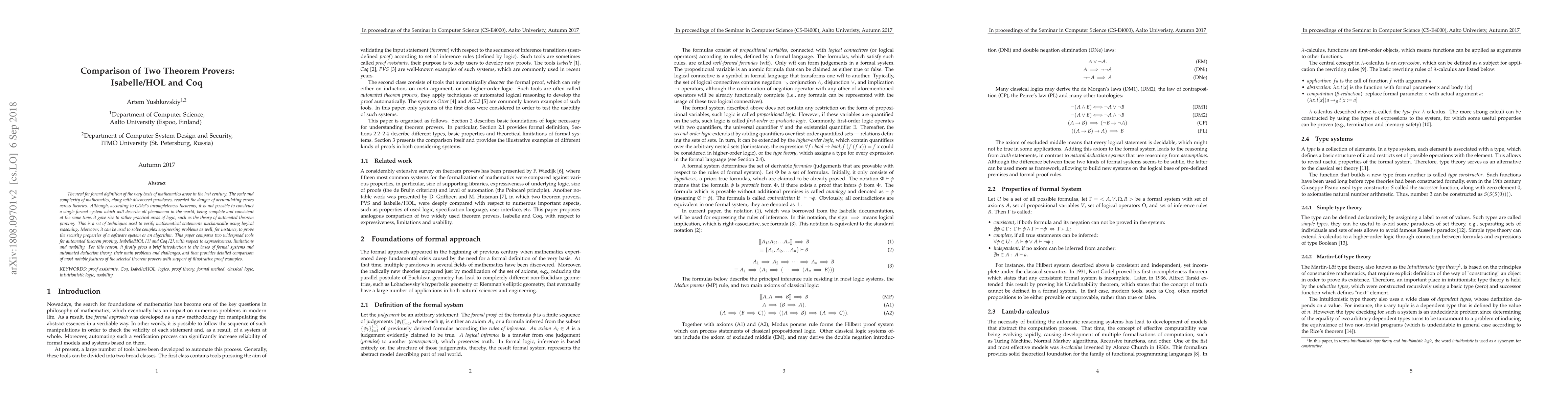 The paper compares two theorem provers, Isabelle/HOL and Coq, by examining their expressiveness, limitations, and usability through detailed feature analysis and illustrative proof examples.