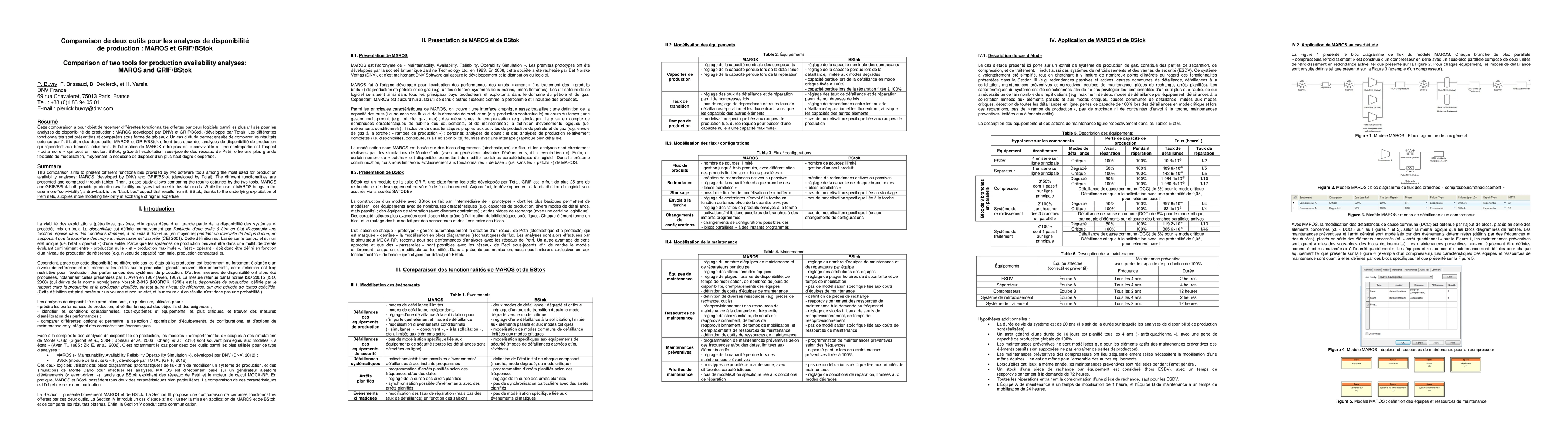 This comparison aims to present different functionalities provided by two software tools among the most used for production availability analyses: MAROS (developed by DNV) and GRIF/BStok (developed by Total). The different functionalities are presented and compared through tables. Then, a case study allows comparing the results obtained by the two tools. MAROS and GRIF/BStok both provide production availability analyses that meet industrial needs. While the use of MAROS brings to the user more "conviviality", a drawback is the "black box" aspect that results from it. BStok, thanks to the underlying exploitation of Petri nets, supplies more modeling flexibility in exchange of higher expertise.