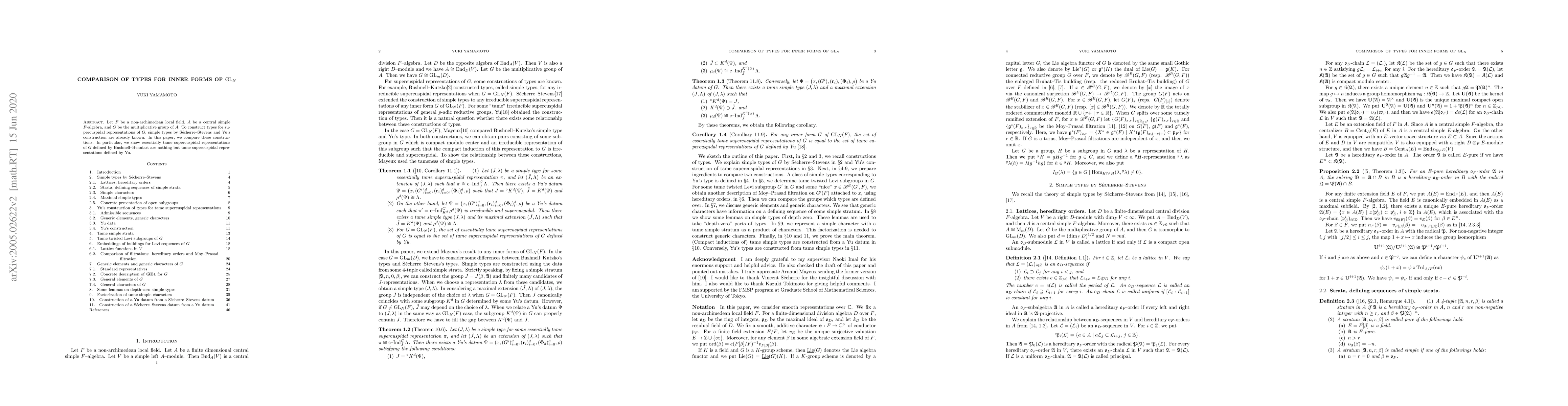 Let $F$ be a non-archimedean local field, $A$ be a central simple $F$-algebra, and $G$ be the multiplicative group of $A$. To construct types for supercuspidal representations of $G$, simple types by S\'echerre--Stevens and Yu's construction are already known. In this paper, we compare these constructions. In particular, we show essentially tame supercuspidal representations of $G$ defined by Bushnell--Henniart are nothing but tame supercuspidal representations defined by Yu.