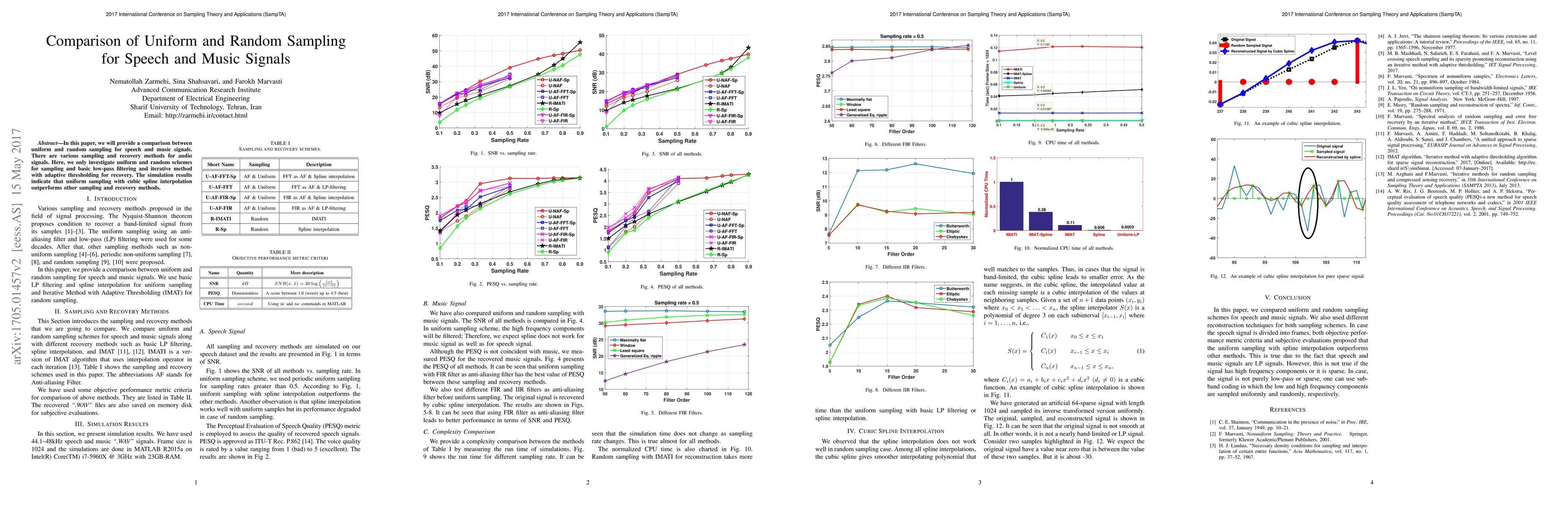 This paper compares uniform and random sampling methods for speech and music signals, focusing on basic low-pass filtering and iterative recovery techniques. Simulation results show that uniform sampling with cubic spline interpolation is superior to other methods.