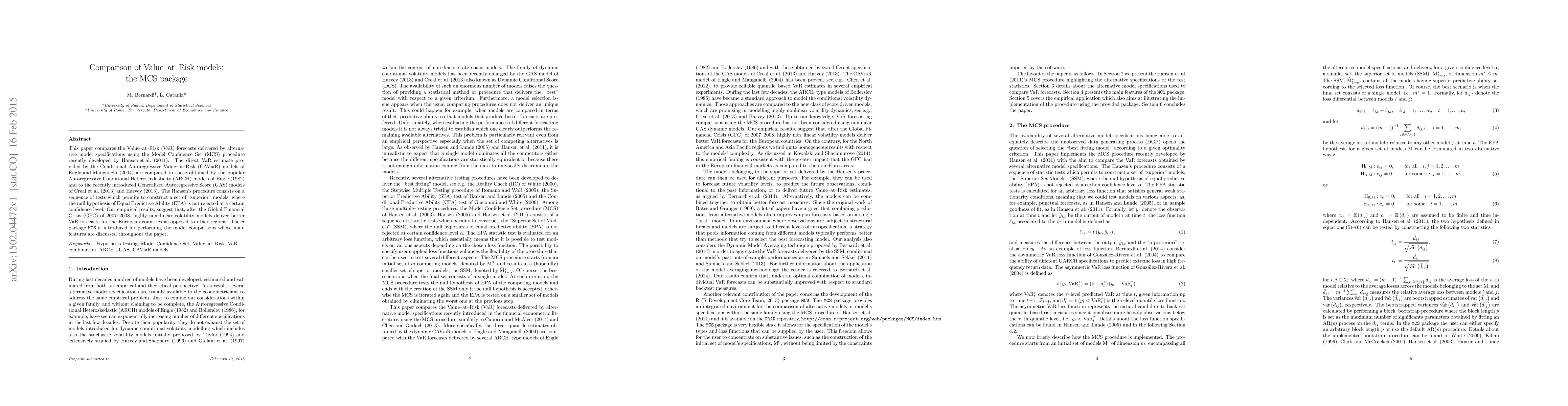 This paper compares the Value--at--Risk (VaR) forecasts delivered by alternative model specifications using the Model Confidence Set (MCS) procedure recently developed by Hansen et al. (2011). The direct VaR estimate provided by the Conditional Autoregressive Value--at--Risk (CAViaR) models of Eengle and Manganelli (2004) are compared to those obtained by the popular Autoregressive Conditional Heteroskedasticity (ARCH) models of Engle (1982) and to the recently introduced Generalised Autoregressive Score (GAS) models of Creal et al. (2013) and Harvey (2013). The Hansen's procedure consists on a sequence of tests which permits to construct a set of "superior" models, where the null hypothesis of Equal Predictive Ability (EPA) is not rejected at a certain confidence level. Our empirical results, suggest that, after the Global Financial Crisis (GFC) of 2007-2008, highly non-linear volatility models deliver better VaR forecasts for the European countries as opposed to other regions. The R package MCS is introduced for performing the model comparisons whose main features are discussed throughout the paper.