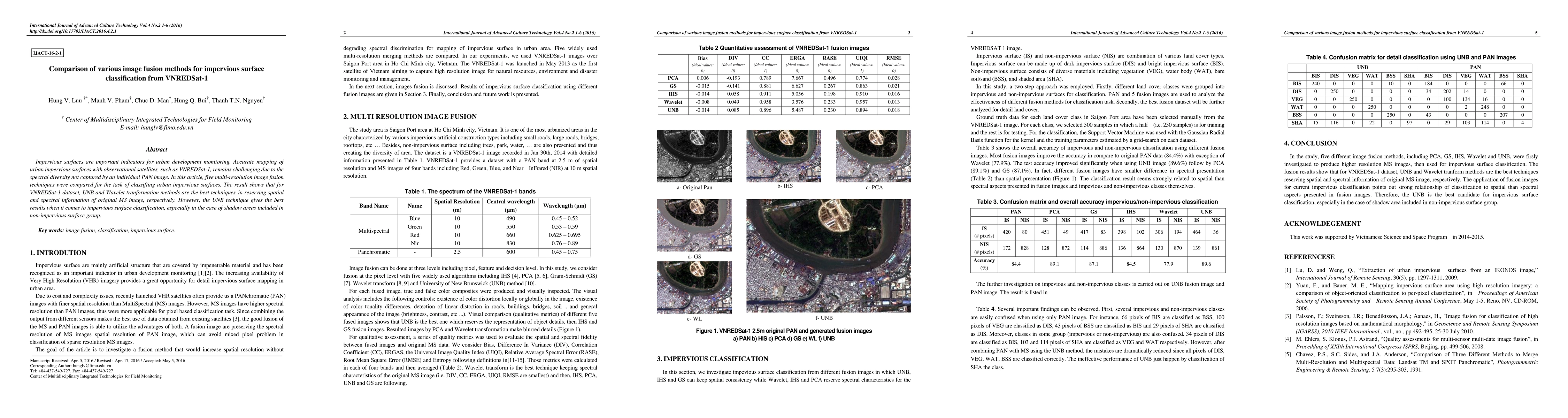 Researchers compared five image fusion methods for classifying impervious surfaces from VNREDSat-1 images, finding that the UNB and Wavelet transform techniques yield the best results while preserving spatial and spectral information.