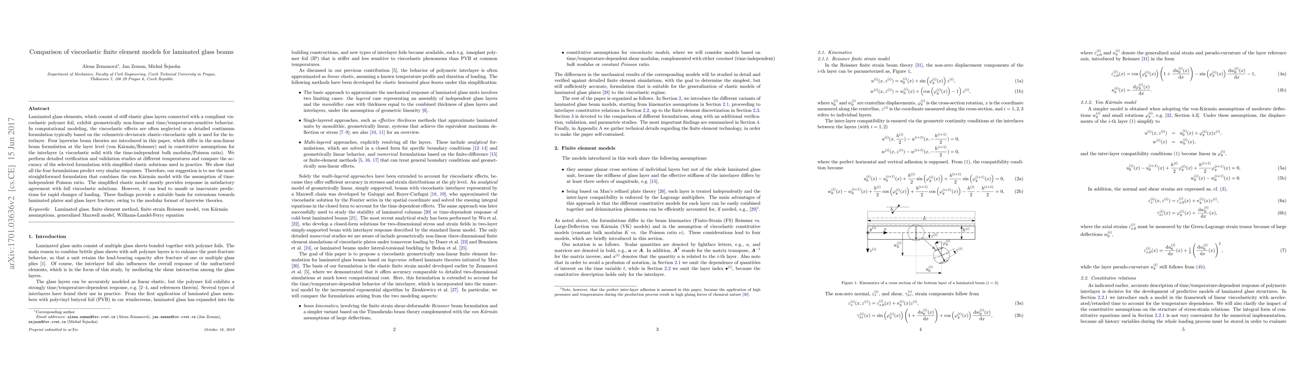 This paper introduces four layerwise beam theories for modeling laminated glass beams, comparing their accuracy against simplified elastic solutions. The study finds that the most straightforward viscoelastic model, combining von Kármán theory with a time-independent Poisson ratio, provides satisfactory results, while simplified elastic models can be unsafe for rapid loading changes.