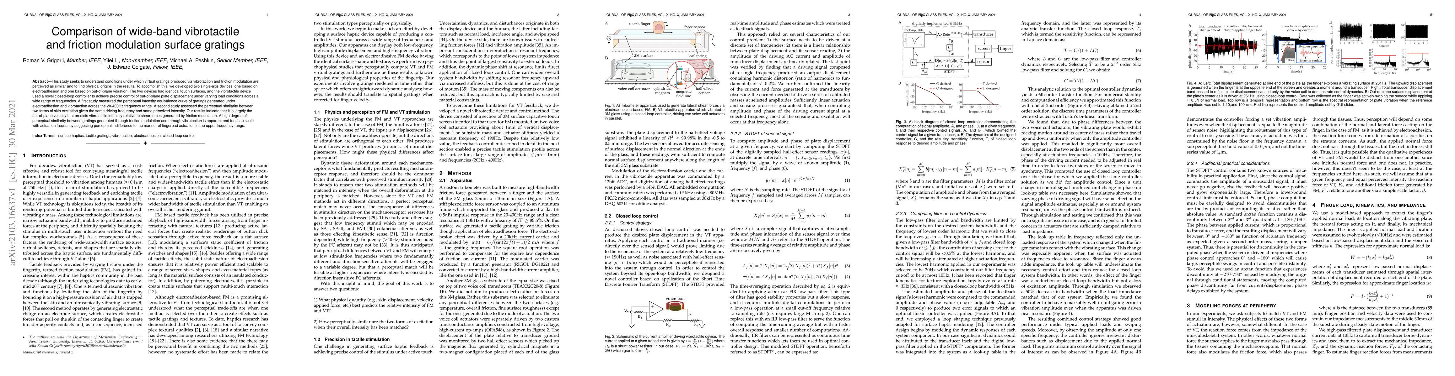 This study seeks to understand conditions under which virtual gratings produced via vibrotaction and friction modulation are perceived as similar and to find physical origins in the results. To accomplish this, we developed two single-axis devices, one based on electroadhesion and one based on out-of-plane vibration. The two devices had identical touch surfaces, and the vibrotactile device used a novel closed-loop controller to achieve precise control of out-of-plane plate displacement under varying load conditions across a wide range of frequencies. A first study measured the perceptual intensity equivalence curve of gratings generated under electroadhesion and vibrotaction across the 20-400Hz frequency range. A second study assessed the perceptual similarity between two forms of skin excitation given the same driving frequency and same perceived intensity. Our results indicate that it is largely the out-of-plane velocity that predicts vibrotactile intensity relative to shear forces generated by friction modulation. A high degree of perceptual similarity between gratings generated through friction modulation and through vibrotaction is apparent and tends to scale with actuation frequency suggesting perceptual indifference to the manner of fingerpad actuation in the upper frequency range.