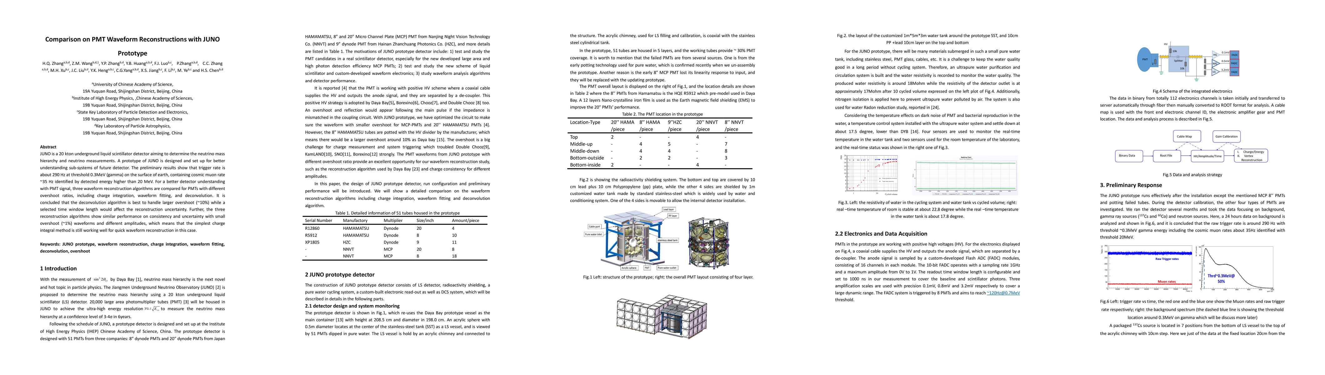 A JUNO prototype detector was set up, including most sub-systems, and its performance was evaluated. Three PMT waveform reconstruction algorithms—charge integration, waveform fitting, and deconvolution—were compared using data from PMTs with different overshoot ratios.