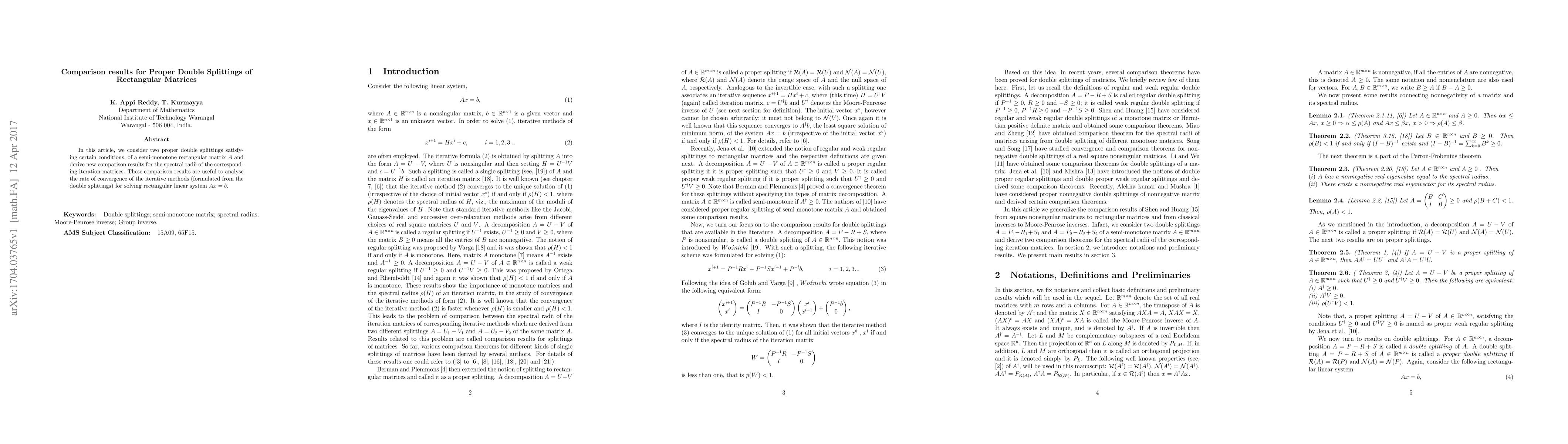 This paper compares two proper double splittings of a semi-monotone rectangular matrix A to derive new results on the spectral radii of their iteration matrices, which helps analyze convergence rates for solving linear systems.