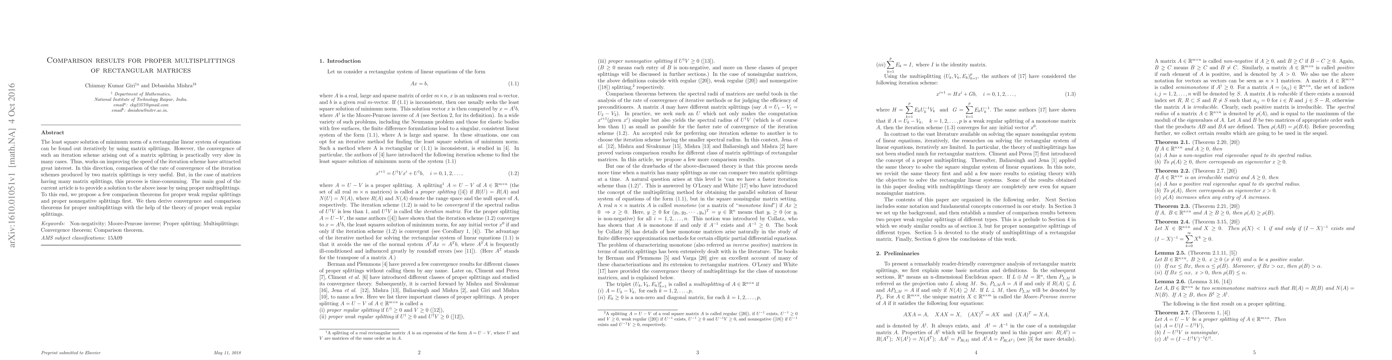This paper proposes comparison theorems for proper multisplittings to improve the convergence speed of matrix splittings in rectangular linear systems, providing a solution to slow iteration schemes.