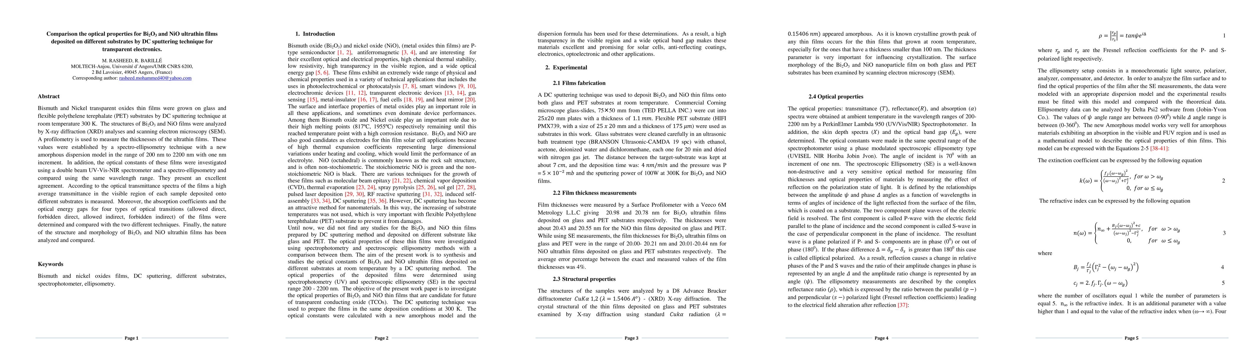 Bismuth and Nickel transparent oxides thin films were grown on glass and flexible polythelene terephalate (PET) substrates by DC sputtering technique at room temperature 300 K. The structures of Bi2O3 and NiO films were analyzed by X-ray diffraction (XRD) analyses and scanning electron microscopy (SEM). A profilometry is used to measure the thicknesses of the ultrathin films. These values were established by a spectro-ellipsometry technique with a new amorphous dispersion model in the range of 200 nm to 2200 nm with one nm increment. In addition, the optical constants of these films were investigated using a double beam UV-Vis-NIR spectrometer and a spectro-ellipsometry and compared using the same wavelength range. They present an excellent agreement. According to the optical transmittance spectra of the films a high average transmittance in the visible region of each sample deposited onto different substrates is measured. Moreover, the absorption coefficients and the optical energy gaps for four types of optical transitions (allowed direct, forbidden direct, allowed indirect, forbidden indirect) of the films were determined and compared with the two different techniques. Finally, the nature of the structure and morphology of Bi2O3 and NiO ultrathin films has been analyzed and compared.