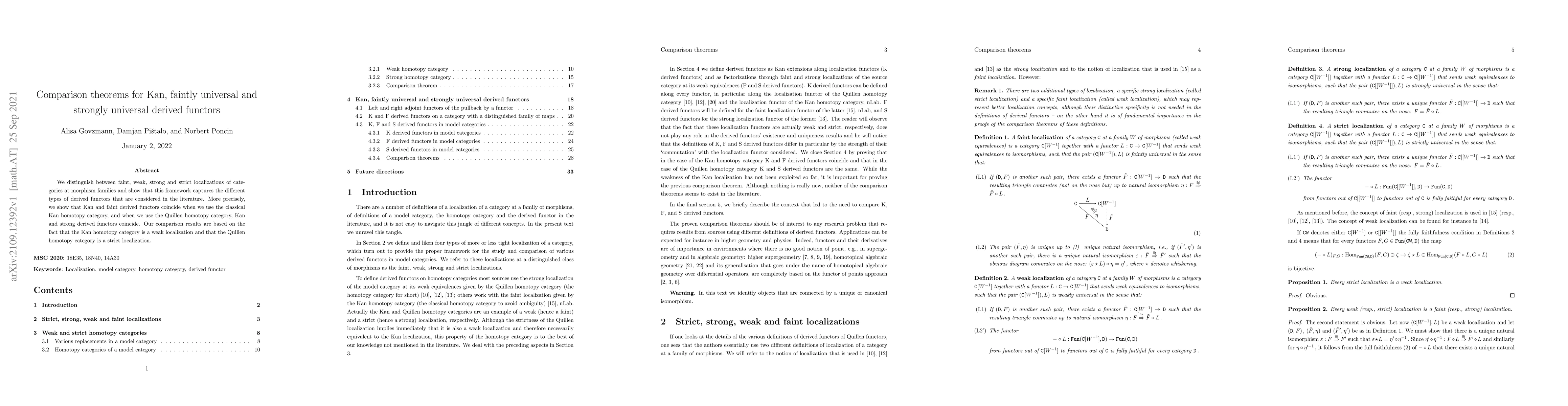 We distinguish between faint, weak, strong and strict localizations of categories at morphism families and show that this framework captures the different types of derived functors that are considered in the literature. More precisely, we show that Kan and faint derived functors coincide when we use the classical Kan homotopy category, and when we use the Quillen homotopy category, Kan and strong derived functors coincide. Our comparison results are based on the fact that the Kan homotopy category is a weak localization and that the Quillen homotopy category is a strict localization.