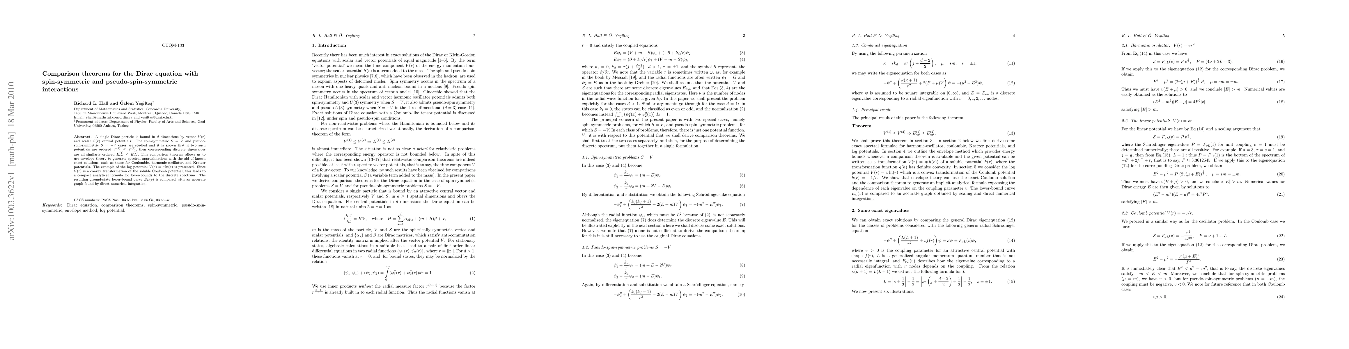 This paper establishes a comparison theorem for Dirac particles under spin-symmetric and pseudo-spin-symmetric potentials, showing eigenvalue ordering. It uses envelope theory to derive spectral approximations and presents analytical lower-bound formulas for the log potential, comparing them with numerical results.