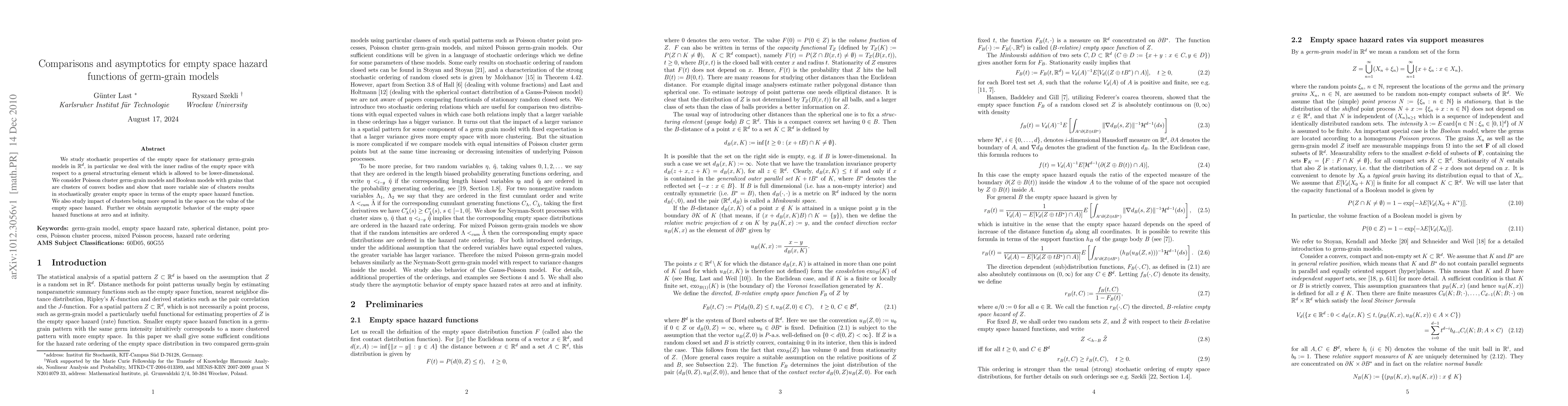 Research studies the empty space in germ-grain models for d-dimensional space, finding that more variable cluster sizes lead to greater empty space and spread clusters increase hazard values.