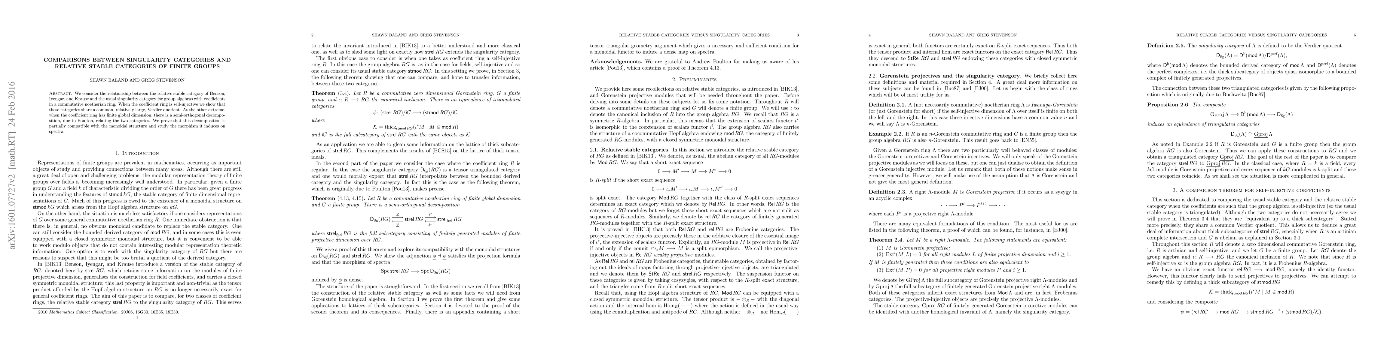 We consider the relationship between the relative stable category of Benson, Iyengar, and Krause and the usual singularity category for group algebras with coefficients in a commutative noetherian ring. When the coefficient ring is self-injective we show that these categories share a common, relatively large, Verdier quotient. At the other extreme, when the coefficient ring has finite global dimension, there is a semi-orthogonal decomposition, due to Poulton, relating the two categories. We prove that this decomposition is partially compatible with the monoidal structure and study the morphism it induces on spectra.