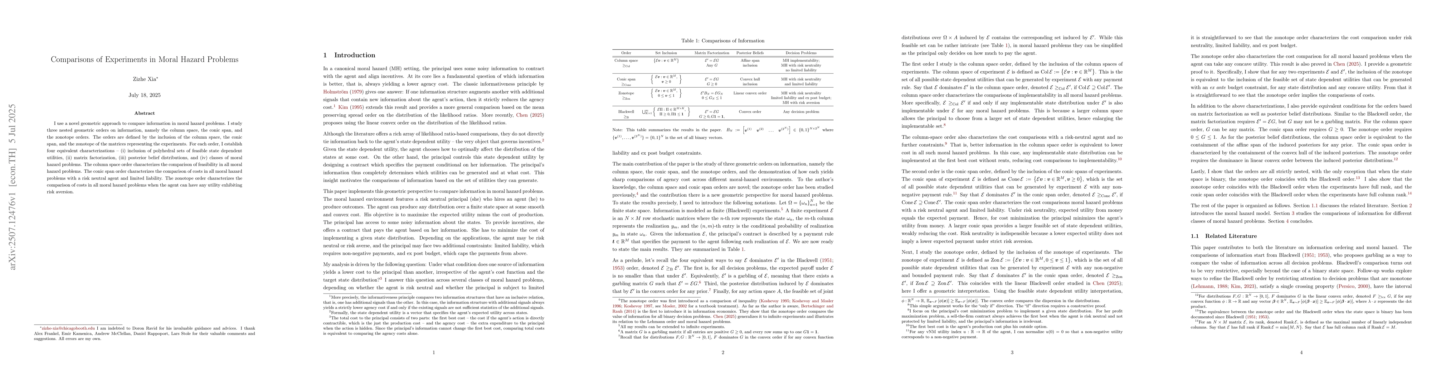 I use a novel geometric approach to compare information in moral hazard problems. I study three nested geometric orders on information, namely the column space, the conic span, and the zonotope orders. The orders are defined by the inclusion of the column space, the conic span, and the zonotope of the matrices representing the experiments. For each order, I establish four equivalent characterizations, (i) inclusion of polyhedral sets of feasible state dependent utilities, (ii) matrix factorization, (iii) posterior belief distributions, and (iv) classes of moral hazard problems. The column space order characterizes the comparison of feasibility in all moral hazard problems. The conic span order characterizes the comparison of costs in all moral hazard problems with a risk neutral agent and limited liability. The zonotope order characterizes the comparison of costs in all moral hazard problems when the agent can have any utility exhibiting risk aversion.