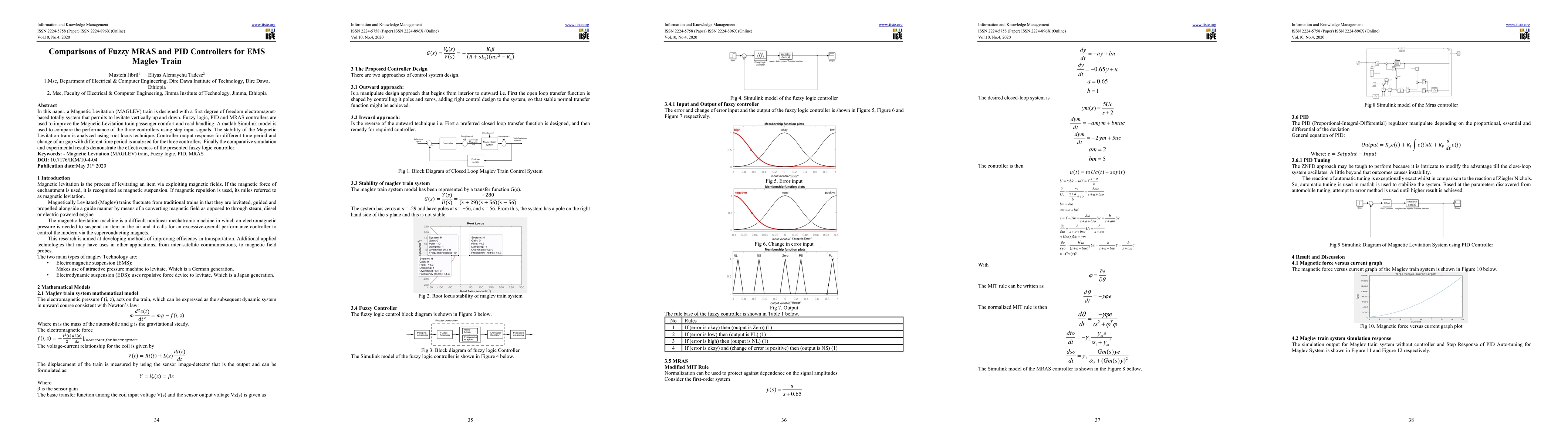 This paper compares the performance of Fuzzy MRAS, PID, and MRAS controllers for a MAGLEV train's vertical levitation system, using MATLAB Simulink simulations. The results show that the fuzzy logic controller provides superior stability and performance compared to PID and MRAS controllers.