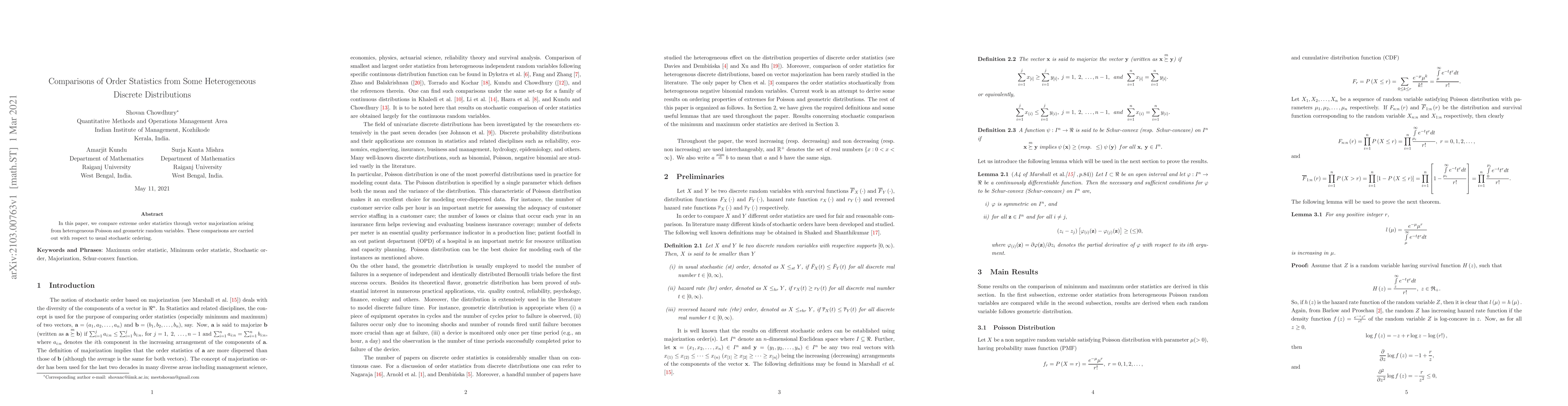 Summary: This paper compares extreme order statistics from heterogeneous Poisson and geometric distributions using vector majorization and stochastic ordering to determine relative performance. The focus is on how these distributions rank in terms of their extreme values.