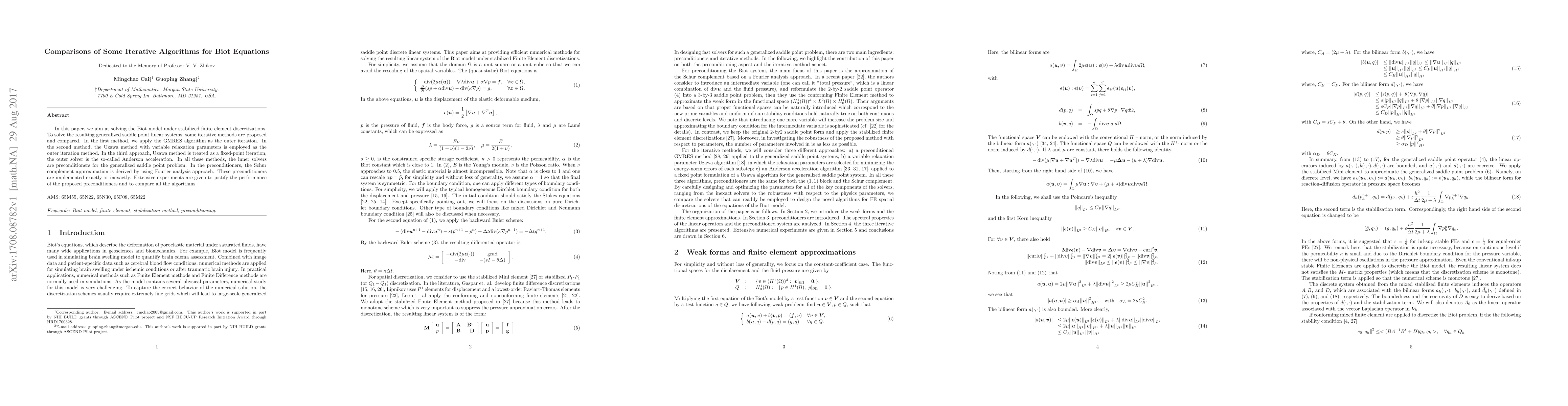In this paper, we aim at solving the Biot model under stabilized finite element discretizations. To solve the resulting generalized saddle point linear systems, some iterative methods are proposed and compared. In the first method, we apply the GMRES algorithm as the outer iteration. In the second method, the Uzawa method with variable relaxation parameters is employed as the outer iteration method. In the third approach, Uzawa method is treated as a fixed-point iteration, the outer solver is the so-called Anderson acceleration. In all these methods, the inner solvers are preconditioners for the generalized saddle point problem. In the preconditioners, the Schur complement approximation is derived by using Fourier analysis approach. These preconditioners are implemented exactly or inexactly. Extensive experiments are given to justify the performance of the proposed preconditioners and to compare all the algorithms.