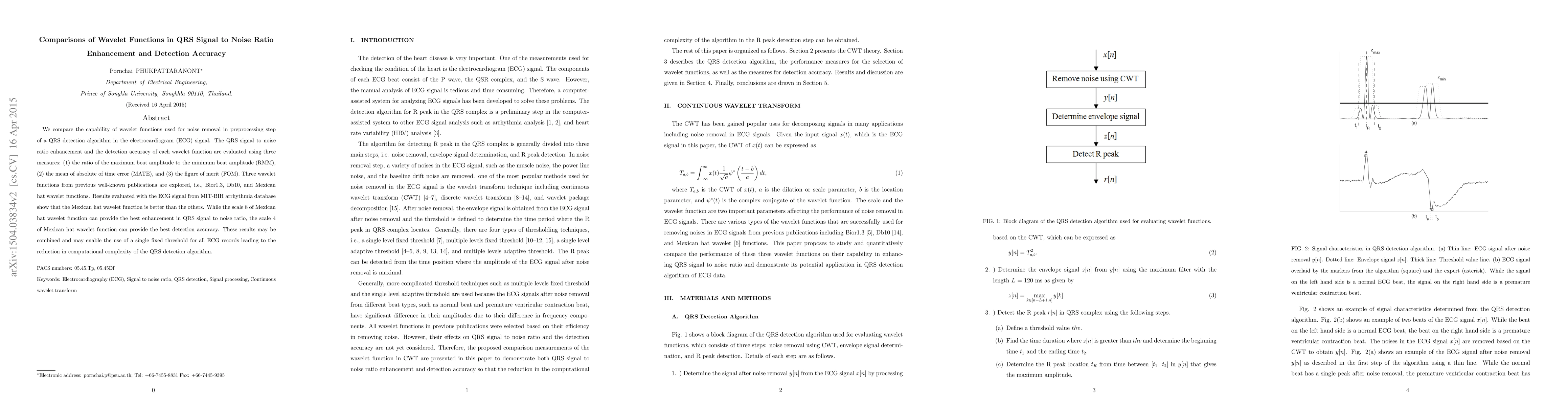 We compare the capability of wavelet functions used for noise removal in preprocessing step of a QRS detection algorithm in the electrocardiogram (ECG) signal. The QRS signal to noise ratio enhancement and the detection accuracy of each wavelet function are evaluated using three measures: (1) the ratio of the maximum beat amplitude to the minimum beat amplitude (RMM), (2) the mean of absolute of time error (MATE), and (3) the figure of merit (FOM). Three wavelet functions from previous well-known publications are explored, i.e., Bior1.3, Db10, and Mexican hat wavelet functions. Results evaluated with the ECG signal from MIT-BIH arrhythmia database show that the Mexican hat wavelet function is better than the others. While the scale 8 of Mexican hat wavelet function can provide the best enhancement in QRS signal to noise ratio, the scale 4 of Mexican hat wavelet function can provide the best detection accuracy. These results may be combined and may enable the use of a single fixed threshold for all ECG records leading to the reduction in computational complexity of the QRS detection algorithm.