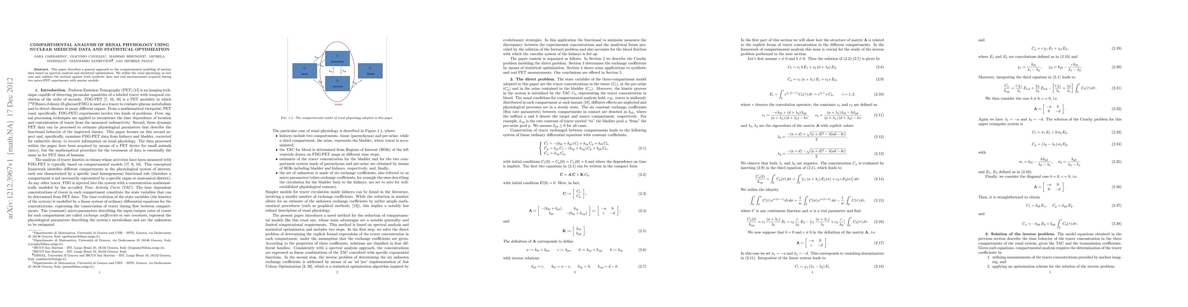 This paper presents a method for compartmental modeling of nuclear data using spectral analysis and statistical optimization, applying it to renal physiology in murine models, and validates the approach through synthetic and real micro-PET data.