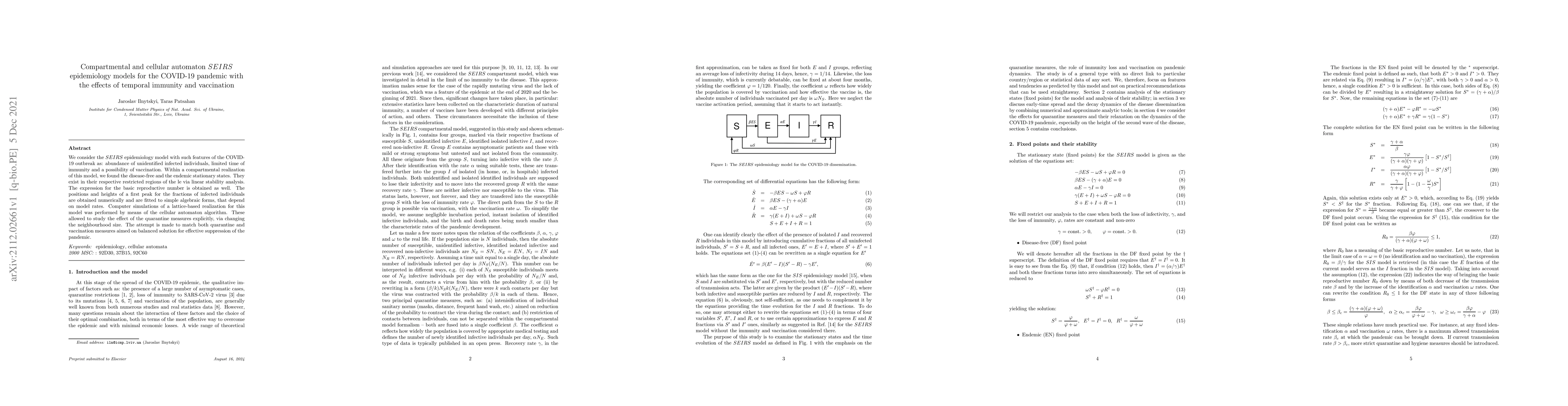 This paper explores the $SEIRS$ epidemiology model for COVID-19, incorporating unidentified infections, temporary immunity, and vaccination. It analyzes stationary states and the basic reproductive number, and uses both compartmental and cellular automaton approaches to simulate the pandemic's dynamics, assessing the impact of quarantine and vaccination strategies.