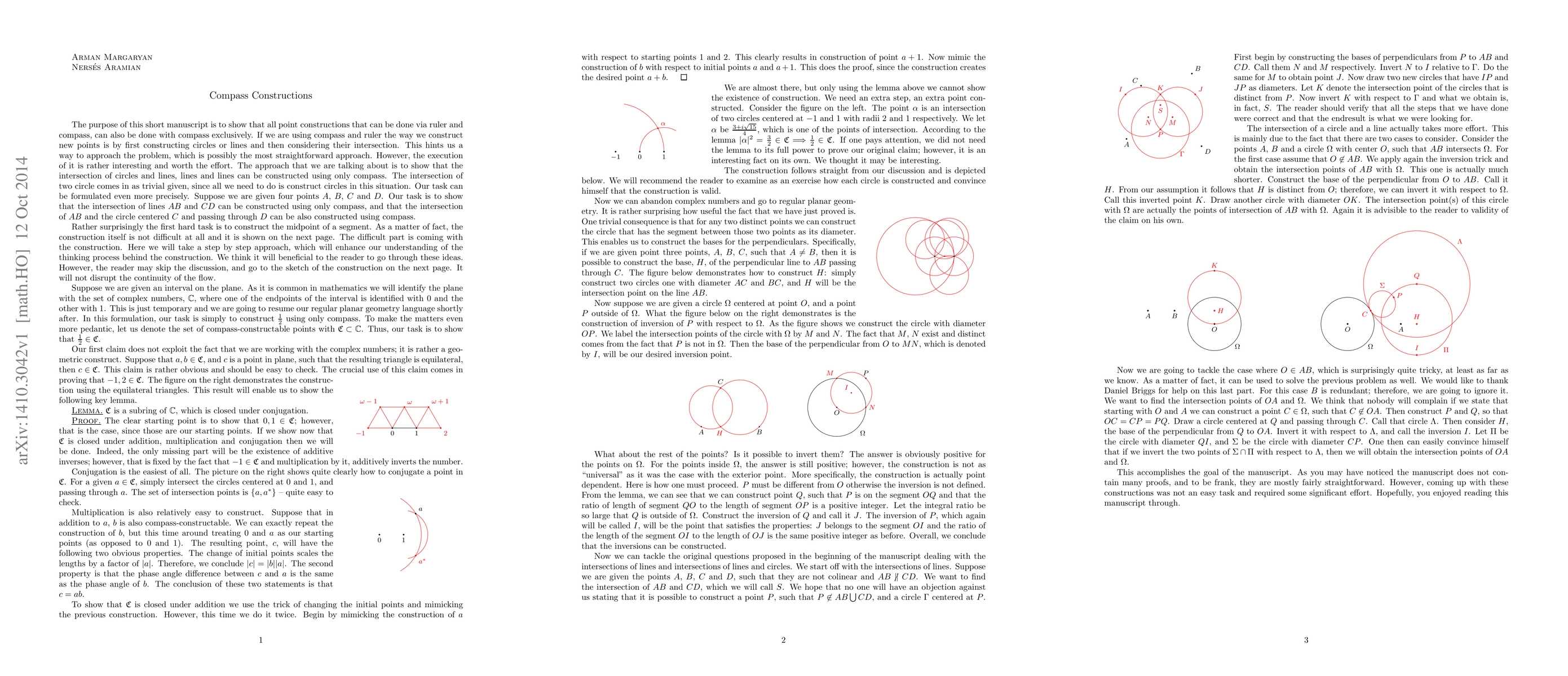 The purpose of this short manuscript is to show that all point constructions that can be done via ruler and compass, can also be done with compass exclusively. If we are using compass and ruler the way we construct new points is by first constructing circles or lines and then considering their intersection. This hints us a way to approach the problem, which is possibly the most straightforward approach. However, the execution of it is rather interesting and worth the effort. The approach that we are talking about is to show that the intersection of circles and lines, lines and lines can be constructed using only compass. The intersection of two circle comes in as trivial given, since all we need to do is construct circles in this situation. Our task can be formulated even more precisely. Suppose we are given four points A, B, C and D. Our task is to show that the intersection of lines AB and CD can be constructed using only compass, and that the intersection of AB and the circle centered C and passing through D can be also constructed using compass.