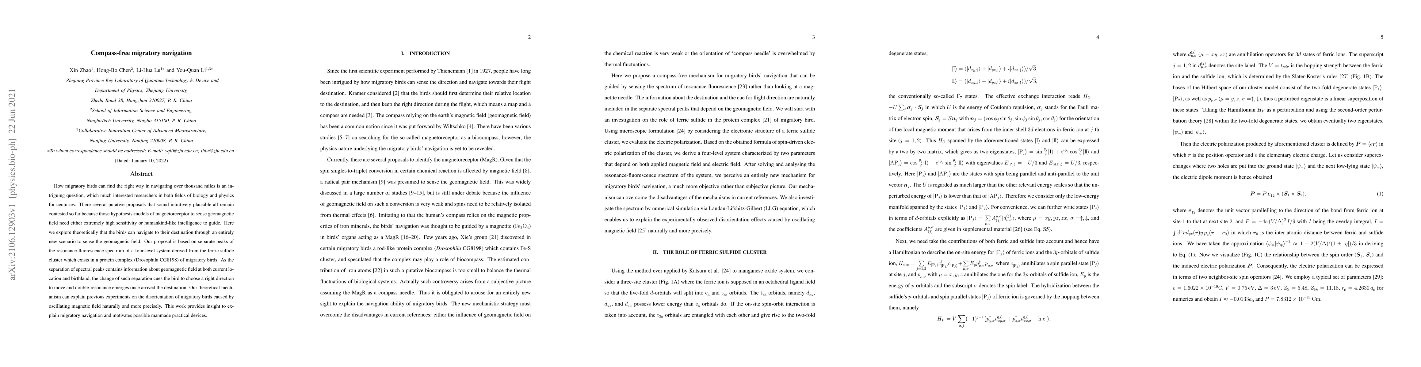 How migratory birds can find the right way in navigating over thousand miles is an intriguing question, which much interested researchers in both fields of biology and physics for centuries. There several putative proposals that sound intuitively plausible all remain contested so far because those hypothesis-models of magnetoreceptor to sense geomagnetic field need either extremely high sensitivity or humankind-like intelligence to guide. Here we explore theoretically that the birds can navigate to their destination through an entirely new scenario to sense the geomagnetic field. Our proposal is based on separate peaks of the resonance-fluorescence spectrum of a four-level system derived from the ferric sulfide cluster which exists in a protein complex (Drosophila CG8198) of migratory birds. As the separation of spectral peaks contains information about geomagnetic field at both current location and birthland, the change of such separation cues the bird to choose a right direction to move and double-resonance emerges once arrived the destination. Our theoretical mechanism can explain previous experiments on the disorientation of migratory birds caused by oscillating magnetic field naturally and more precisely. This work provides insight to explain migratory navigation and motivates possible manmade practical devices.