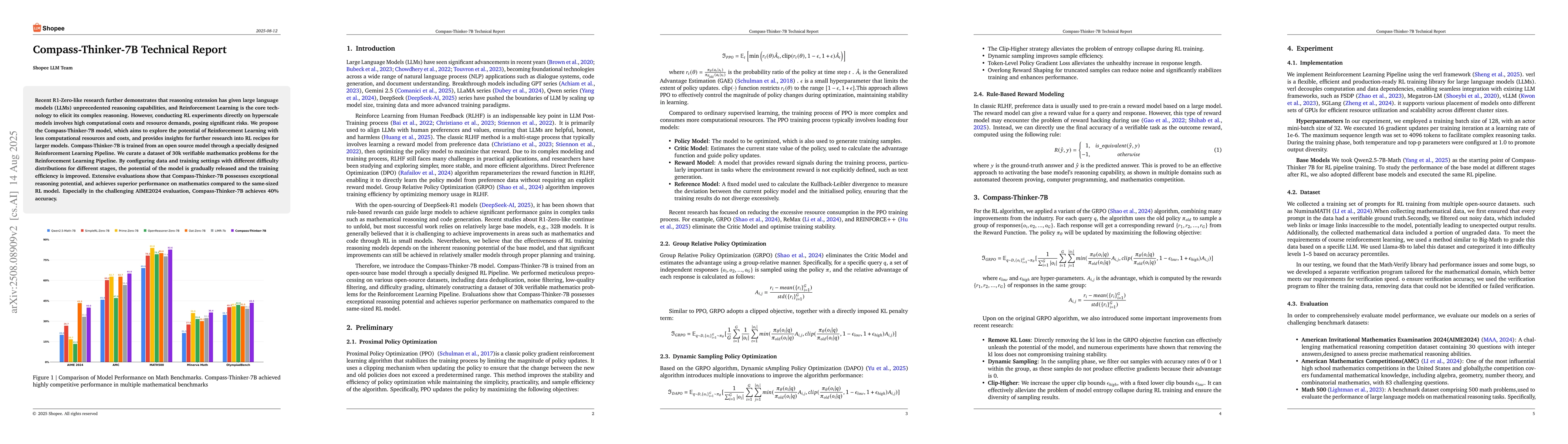 Recent R1-Zero-like research further demonstrates that reasoning extension has given large language models (LLMs) unprecedented reasoning capabilities, and Reinforcement Learning is the core technology to elicit its complex reasoning. However, conducting RL experiments directly on hyperscale models involves high computational costs and resource demands, posing significant risks. We propose the Compass-Thinker-7B model, which aims to explore the potential of Reinforcement Learning with less computational resources and costs, and provides insights for further research into RL recipes for larger models. Compass-Thinker-7B is trained from an open source model through a specially designed Reinforcement Learning Pipeline. We curate a dataset of 30k verifiable mathematics problems for the Reinforcement Learning Pipeline. By configuring data and training settings with different difficulty distributions for different stages, the potential of the model is gradually released and the training efficiency is improved. Extensive evaluations show that Compass-Thinker-7B possesses exceptional reasoning potential, and achieves superior performance on mathematics compared to the same-sized RL model. Especially in the challenging AIME2024 evaluation, Compass-Thinker-7B achieves 40% accuracy.