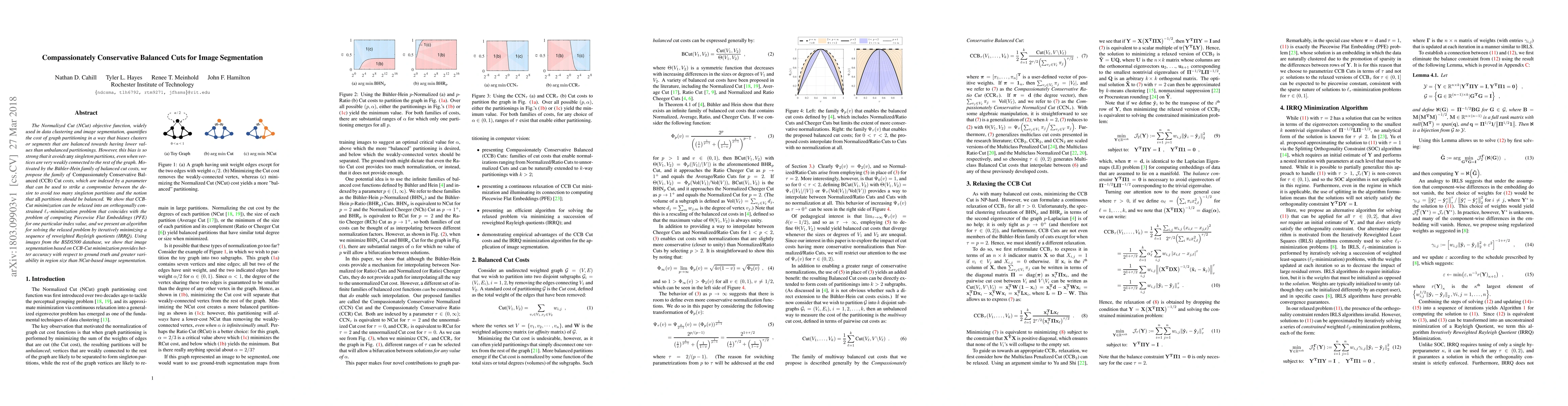 The Normalized Cut (NCut) objective function, widely used in data clustering and image segmentation, quantifies the cost of graph partitioning in a way that biases clusters or segments that are balanced towards having lower values than unbalanced partitionings. However, this bias is so strong that it avoids any singleton partitions, even when vertices are very weakly connected to the rest of the graph. Motivated by the B\"uhler-Hein family of balanced cut costs, we propose the family of Compassionately Conservative Balanced (CCB) Cut costs, which are indexed by a parameter that can be used to strike a compromise between the desire to avoid too many singleton partitions and the notion that all partitions should be balanced. We show that CCB-Cut minimization can be relaxed into an orthogonally constrained $\ell_{\tau}$-minimization problem that coincides with the problem of computing Piecewise Flat Embeddings (PFE) for one particular index value, and we present an algorithm for solving the relaxed problem by iteratively minimizing a sequence of reweighted Rayleigh quotients (IRRQ). Using images from the BSDS500 database, we show that image segmentation based on CCB-Cut minimization provides better accuracy with respect to ground truth and greater variability in region size than NCut-based image segmentation.