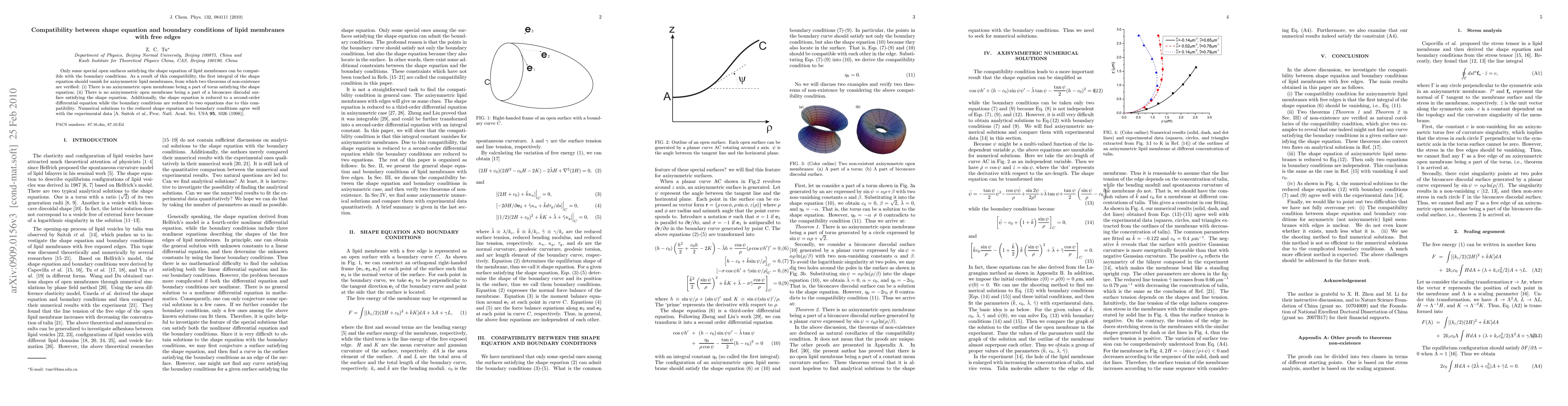Only some special open surfaces satisfying the shape equation of lipid membranes can be compatible with the boundary conditions. As a result of this compatibility, the first integral of the shape equation should vanish for axisymmetric lipid membranes, from which two theorems of non-existence are verified: (i) There is no axisymmetric open membrane being a part of torus satisfying the shape equation; (ii) There is no axisymmetric open membrane being a part of a biconcave discodal surface satisfying the shape equation. Additionally, the shape equation is reduced to a second-order differential equation while the boundary conditions are reduced to two equations due to this compatibility. Numerical solutions to the reduced shape equation and boundary conditions agree well with the experimental data [A. Saitoh \emph{et al.}, Proc. Natl. Acad. Sci. USA \textbf{95}, 1026 (1998)].