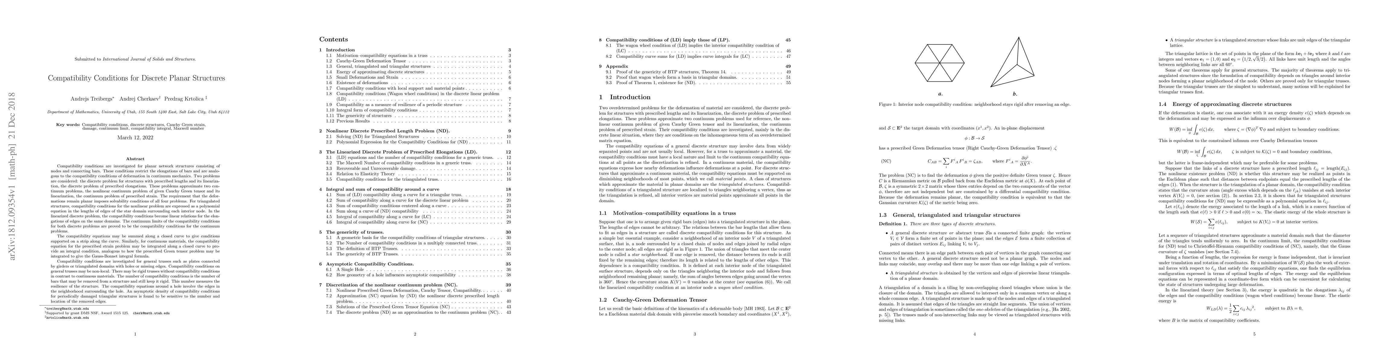 Compatibility conditions are investigated for planar network structures consisting of nodes and connecting bars; these conditions restrict the elongations of bars and are analogous to the compatibility conditions of deformation in continuum mechanics. The requirement that the deformations remain planar imposes compatibility. Compatibility for structures with prescribed lengths and its linearization is considered. For triangulated structures, compatibility is expressed as a polynomial equation in the lengths of edges of the star domain surrounding each interior node. The continuum limits of the conditions coincide with those in the continuum problems. The compatibility equations may be summed along a closed curve to give conditions analogous to Gauss-Bonnet integral formula. There are rigid trusses without compatibility conditions in contrast to continuous materials. The compatibility equations around a hole involve the edges in the neighborhood surrounding the hole. The number of compatibility conditions is the number of bars that may be removed from a structure while keeping it rigid; this number measures the structural resilience. An asymptotic density of compatibility conditions is analyzed.